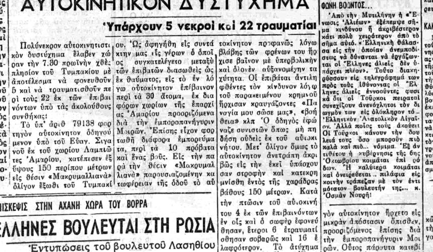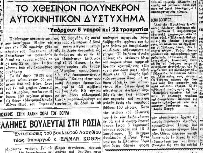 Πολύνεκρον αυτοκινητιστικόν δυστύχημα έλαβεν χώραν την 7.30 πρωϊνήν χθες πλησίον του Τυμπακίου με αποτέλεσμα να φονευθούν 5 και να τραυματισθούν περί τους 22 εκ των επιβαινόντων υπό τας ακολούθους συνθήκας :