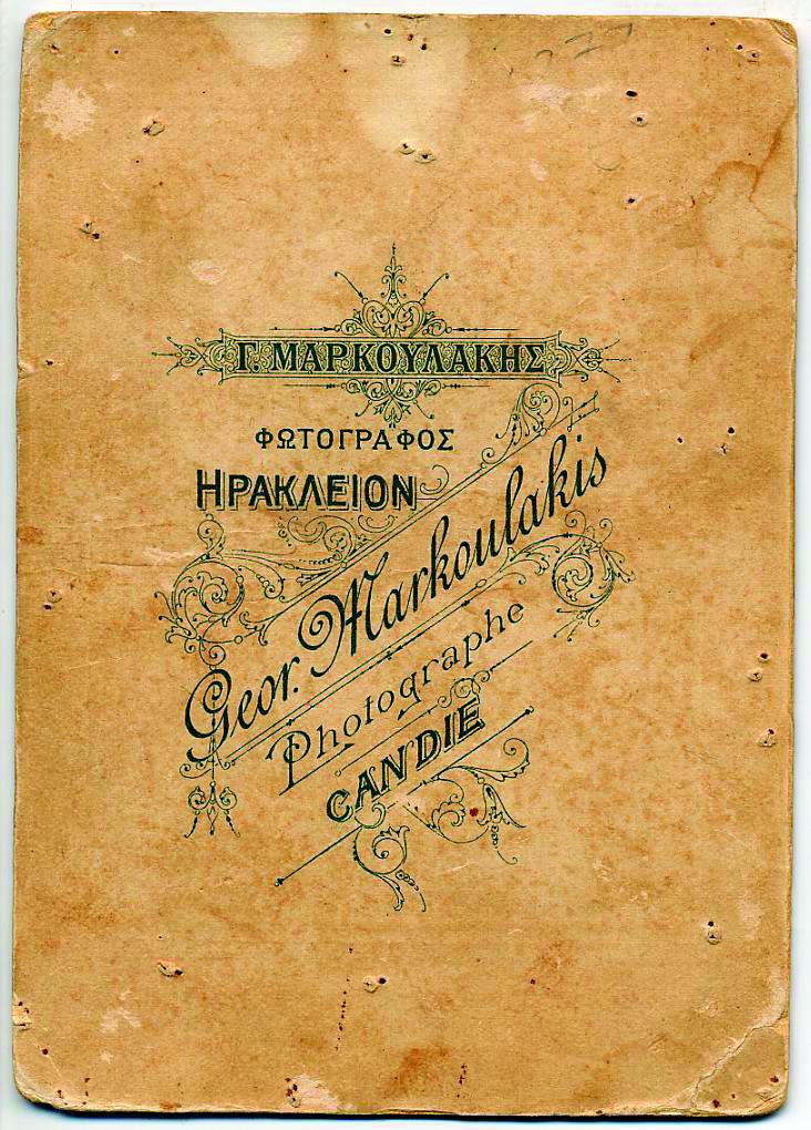 12. Φωτογράφοι του Ρεθύμνου ήταν επίσης ο Κ. Περλιάνης και ο Χαράλαμπος Δρανδάκης. Ο Δρανδάκης κολλούσε τις ακριβές από τις φωτογραφίες που τραβούσε σε χαρτόνι (πασπαρτού), τυπωμένο μ’ ένα από τα πιο όμορφα σήματα φωτογράφου στην Κρήτη.