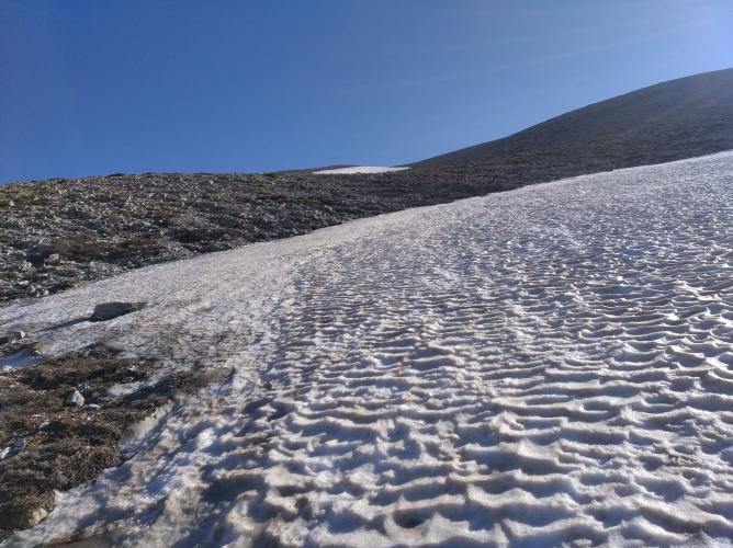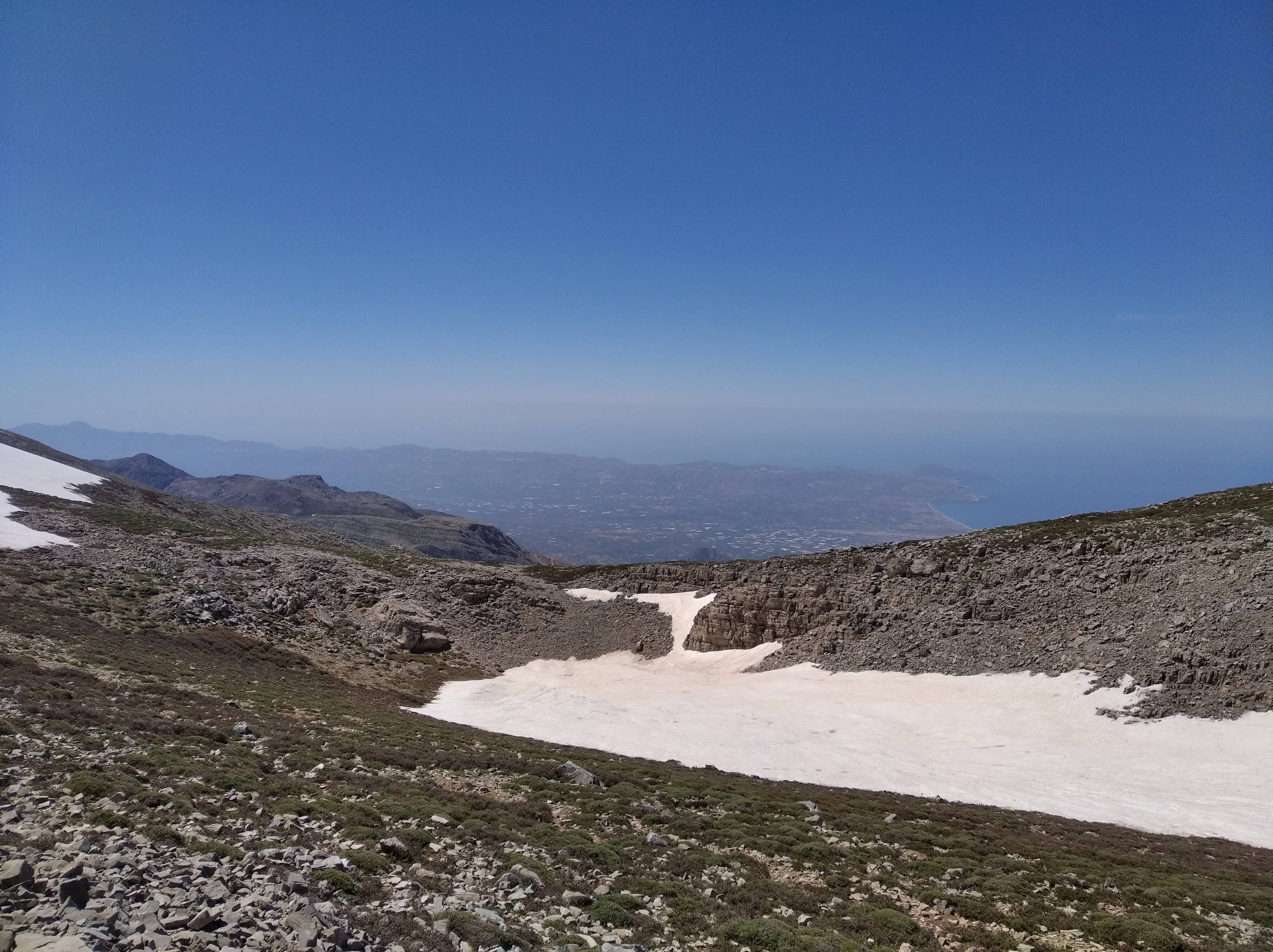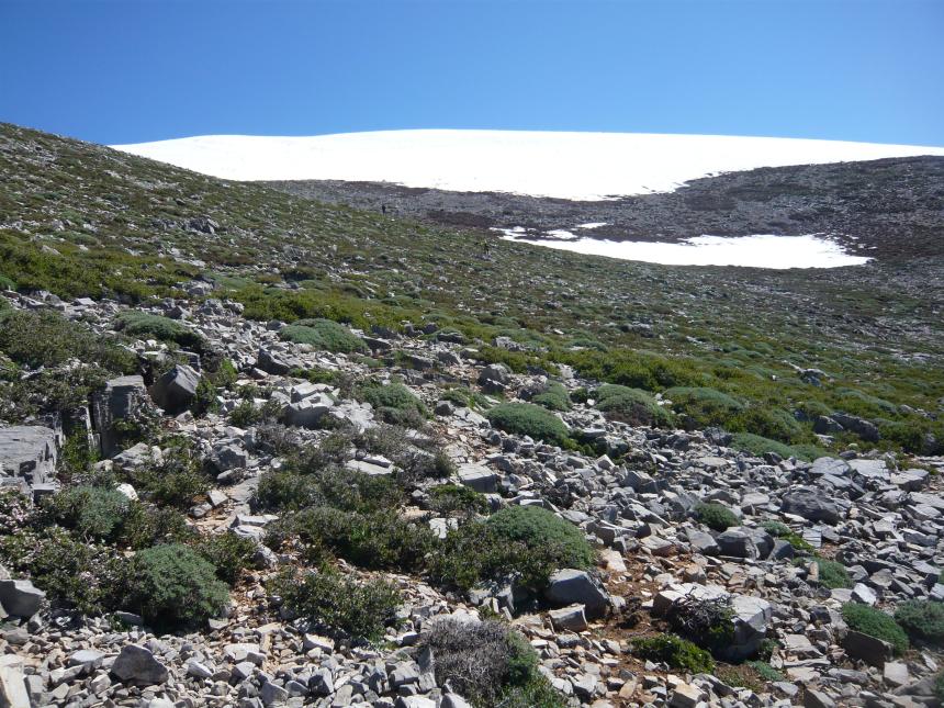 Το 1925 η διαδρομή που ακολουθήθηκε για την ανάβαση στον Ψηλορείτη βρισκόταν ακριβώς πίσω από το στρατόπεδο και διασχίσαμε τις πλαγιές πάνω από το σπήλαιο του Δία. Με συνόδευε ένας Γερμανός ζωολόγος που είχε επισκεφθεί το στρατόπεδό μου την προηγούμενη ημέρα. Βασιζόταν στους βοσκούς για στέγη και τροφή, αλλά σε αυτή την περίσταση μοιράστηκε μαζί μου τη σκηνή και το φαγητό μου. Σκαρφαλώσαμε στην απότομη πλευρά από εύκολα θρυμματιζόμενο βράχο και πάνω στα χαλάσματα, σε ορισμένα σημεία ανοίγοντας πατήματα στις μακριές γλώσσες χιονιού που οδηγούσαν στην κορυφογραμμή από πάνω. Υπολόγισα ότι ήταν μια ανάβαση 1.500 [≈ 457 μ.] έως 2.000 ποδιών. Μόλις φτάσαμε στην κορυφογραμμή, ο ρυθμός μας επιταχύνθηκε σημαντικά από τις χαλαρές επίπεδες πέτρες που έστρωναν τη διαδρομή για κάποια απόσταση κατά μήκος της. Μεγάλες εκτάσεις της στρογγυλεμένης επιφάνειας της κορυφογραμμής και όλες οι κλίσεις της, οι μικρές κοιλάδες και οι κρατηροειδείς κοιλότητες ήταν γεμάτες με χιόνι. Ήταν σε καλή κατάσταση και πρόσθεσε πολύ στην άνεση του βαδίσματος. Στις άκρες ορισμένων χιονισμένων πεδίων όπου το χιόνι έλιωνε, βρήκαμε τα άνθη των βολβωδών φυτών για τα οποία είχα έρθει· ήταν σε όλο τους το μεγαλείο κάτω από τις πιο ευνοϊκές συνθήκες ηλιοφάνειας και γαλήνης.