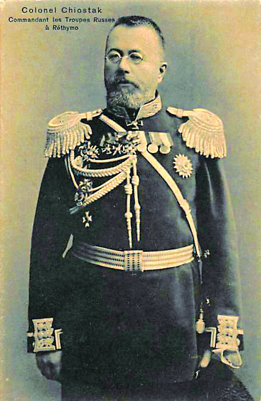 Στο Ρέθυμνο έκανε την εμφάνισή της όχι η “ασιανίζουσα” Ρωσία,η πάσχουσα και διεφθαρμένη, με τα ηφαιστειακά σπλάχνα της να προαναγγέλλουν την κοντινή έκρηξη,αλλά η “ευρωπαίζουσα” όψη της δεσποτικής Ρωσίας.Παρουσιάστηκε μια στρατιωτική αριστοκρατία ανώτερων αξιωματούχων με επικεφαλή τον Χιόστακ, χωρίς έκδηλα τα συμπτώματα της ρωσικής άρχουσας τάξης. Ο τοπικός τύπος εξήρε σε κάθε ευκαιρία το κοινωφελές έργο του Χιόστακ, τη φιλάνθρωπο διάθεση των Ρώσων αξιωματικών, τα δημόσια έργα της διοίκησης, τους ωραίους τρόπους συμπεριφοράς και ότι «κατά τό χρονικόν διάστημα της ενταύθα παραμονής του ρωσικού στρατού δέν έλαβεν χώραν το ελάχιστον παράπτωμα προς πολίτην ανεξαρτήτως θρησκεύματος σπάνιον και είς στρατούς ευρωπαικών κρατών».[8] Η εικόνα αυτή της Ρωσικής διοίκησης περιοριζόταν μόνο στο πεδίο των λόγων και όχι της καθημερινής πολιτικής πρακτικής. Δεν αμφιβάλουμε ότι η διοίκηση κατοχής μερίμνησε για την πόλη και ανέπτυξε ωφέλιμη δραστηριότητα· εξωραϊσμός της πόλης, βελτίωση της υγειονομικής κατάστασης, ίδρυση αγαθοεργού ταμείου παροχής βοήθειας στους φτωχούς, οδοποιία, ανέγερση και επισκευή κτιρίων.[9] Και οι «ημερήσιαι διατάξεις» εξέφραζαν την απόφαση του Χιόστακ για πολιτική «ίσων αποστάσεων» ανάμεσα στο χριστιανικό και το μουσουλμανικό στοιχείο και ως προς τη μη ένδειξη μεροληπτικής συμπεριφοράς των για τη διατήρηση της τάξεως κατασταλτικών μηχανισμών και ως προς την προστασία και παροχή υπηρεσιών στις δύο κοινότητες, που είχαν τα όπλα «παρά πόδας» και όχι σπάνια «εφ’ όπλου λόγχην».[10]