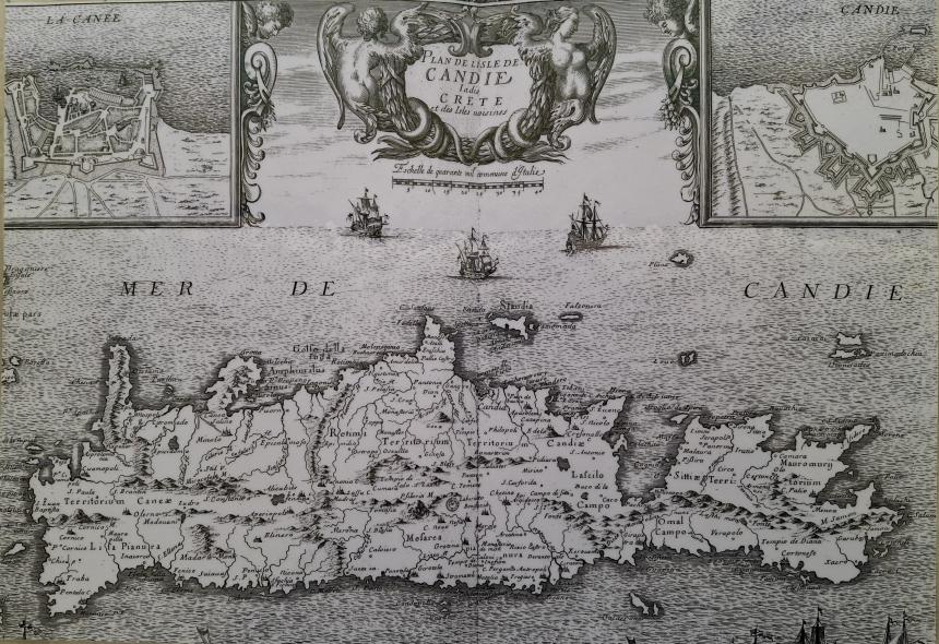 [12] Οι χαλκογραφίες του κειμένου προέρχονται από την έκδοση του περιηγητικού έργου του George Sandys, με εξαίρεση το εξώφυλλο της πρώτης έκδοσης του έργου του που προέρχεται από την ιστοσελίδα του Ιδρύματος Αικατερίνης Λασκαρίδη (https://el.travelogues.gr/item.php?view=43231) και του χάρτη της Κρήτης, του δευτέρου μισού του 17ου αιώνα, που προέρχεται από το προσωπικό μου αρχείο και αποδίδεται στον Γάλλο χαρτογράφο και μηχανικό Sebastien Pontault de Beaulieu. Στον χάρτη απεικονίζεται και το σημείο που κατά τον χαρτογράφο βρισκόταν ο Λαβύρινθος (νότια του Ηρακλείου, κοντά στο Καστέλλι της Μεσαράς και τη Γόρτυνα). Μία χαλκογραφία απεικονίζει τύπο Ελληνίδας από το Πέρα της Κωνσταντινούπολης, ενώ η χαλκογραφία με τους δύο άντρες σε πρώτο πλάνο δείχνει την περιοχή της λίμνης Αβέρνο (Avernus) – η περιοχή αυτή απεικονίζεται ως η είσοδος στον κάτω κόσμο στην Αινειάδα του Βιργιλίου – κοντά στην αρχαία Κύμη (Cuma) της νότιας Ιταλίας. Τη συμπεριέλαβα επειδή η φορεσιά των ανδρών έχει κοινά στοιχεία με τη φορεσιά των Βενετών εκείνης της εποχής που κατείχαν την Κρήτη. Δυστυχώς, στο έργο του Sandys δεν υπάρχει κάποια άλλη χαλκογραφία που να έχει σχέση με την Κρήτη, πέρα από αυτήν του χάρτη της Ανατολικής Μεσογείου. Το σκίτσο του Κρητικού τοξότη είναι από την Ιστορία της Κρήτης του Ι.Δ. Μουρέλλου (Μουρέλλος, 1950, σ. 295) και το σκίτσο με τους καθήμενους γύρω από το τραπέζι είναι από την Επετηρίδα της Εταιρείας Κρητικών Σπουδών (Κουκουλές, 1940, σ. 52) και δείχνει τη φορεσιά ομάδας Κρητικών στα μέσα του 17ου αιώνα. Οι έγχρωμες φωτογραφίες είναι από το προσωπικό μου αρχείο. Ανάμεσα στις φωτογραφίες έχω συμπεριλάβει και φωτογραφία του χωριού μου, των Κουρουτών Αμαρίου, επειδή ο Sandys αναφέρεται αρκετά και στους Κουρήτες, και οι Κουρούτες είναι το χωριό της Κρήτης που συνδέεται πολύ στενά με αυτούς, λόγω της ονομασίας του και παράλληλα της εγγύτητάς του με τον Ψηλορείτη, το βουνό με το οποίο οι Κουρήτες ήταν κυρίως συνδεδεμένοι κατά τη μυθολογία. Από τις εικόνες του μεταφρασμένου κειμένου καμία δεν υπάρχει στις σελίδες που αναφέρονται στην Κρήτη στο πρωτότυπο κείμενο.