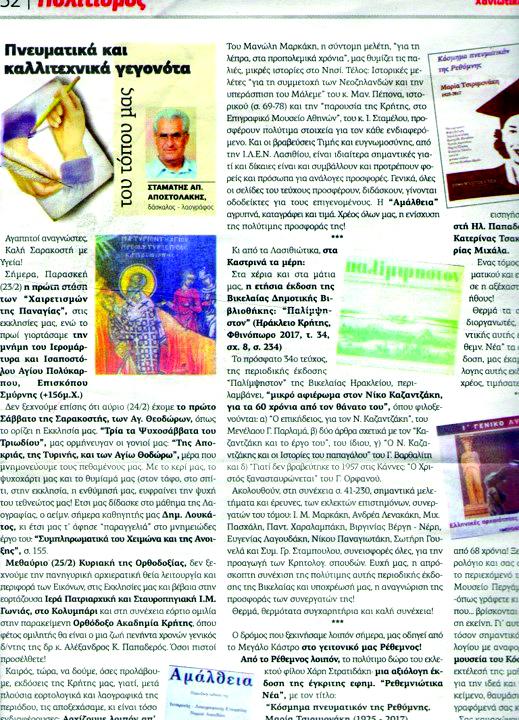 2. Ο Σταμάτης Αποστολάκης διετέλεσε εξαίρετος εκπαιδευτικός αλλά και λαογράφος και ιστορικός. Η Κρήτη ευτύχησε να μελετηθεί από σημαίνοντες Κρητολόγους, μεταξύ των οποίων περιλαμβάνονται και εκλεκτοί λαογράφοι. Πρόκειται για τους αείμνηστους Παύλο Βλαστό, Γεώργιο Σπυριδάκη, Ευαγγελία Φραγκάκη, Γεώργιο Πάγκαλο, Μαρία Λιουδάκη, Ελευθέριο Πλατάκη, Παντελή Βαβουλέ, Ιωάννη Μαυρακάκη, Ειρήνη Παπαδάκη, Ιδομενέα Παπαγρηγοράκη, Στυλιανό Μοτάκη, Γεώργιο Δαφέρμο κ.ά.. Ως συνεχιστές του έργου τους ήρθαν οι Γεώργιος Αικατερινίδης, αείμνηστος κι αυτός από τα τέλη της περασμένης χρονιάς και φίλος του Σταμάτη Αποστολάκη, Γεώργιος Σμπώκος, Αντώνης Πλυμάκης αείμνηστος από τον περασμένο Μάρτιο, Κανάκης Γερωνυμάκης, Βασίλης Χαρωνίτης, Αντώνης Ξανθινάκης, Αριστοφάνης Χουρδάκης, Γεώργιος Παναγιωτάκης, Νίκος Ψιλάκης κ.ά.. Και βέβαια ο Σταμάτης Αποστολάκης, με το μεγάλο λαογραφικό του έργο.