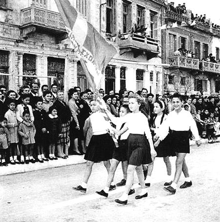 8. Στη φωτογραφία αυτή η παρέλαση έχει μεταφερθεί στη Λεωφόρο Παύλου Κουντουριώτη, Η παρουσία των τεσσάρων κοριτσιών ανάμεσα στα πολυάριθμα αγόρια του Γυμνασίου Αρρένων δικαιολογείται από την μη ύπαρξη «πρακτικού» (θετικής κατεύθυνσης) τμήματος στο Γυμνάσιο Θηλέων, οπότε αναγκάζονταν να φοιτούν στο αντίστοιχο του «Οίκου Παιδείας». Οπωσδήποτε η εμφάνιση αδικεί τη νεότητά τους.