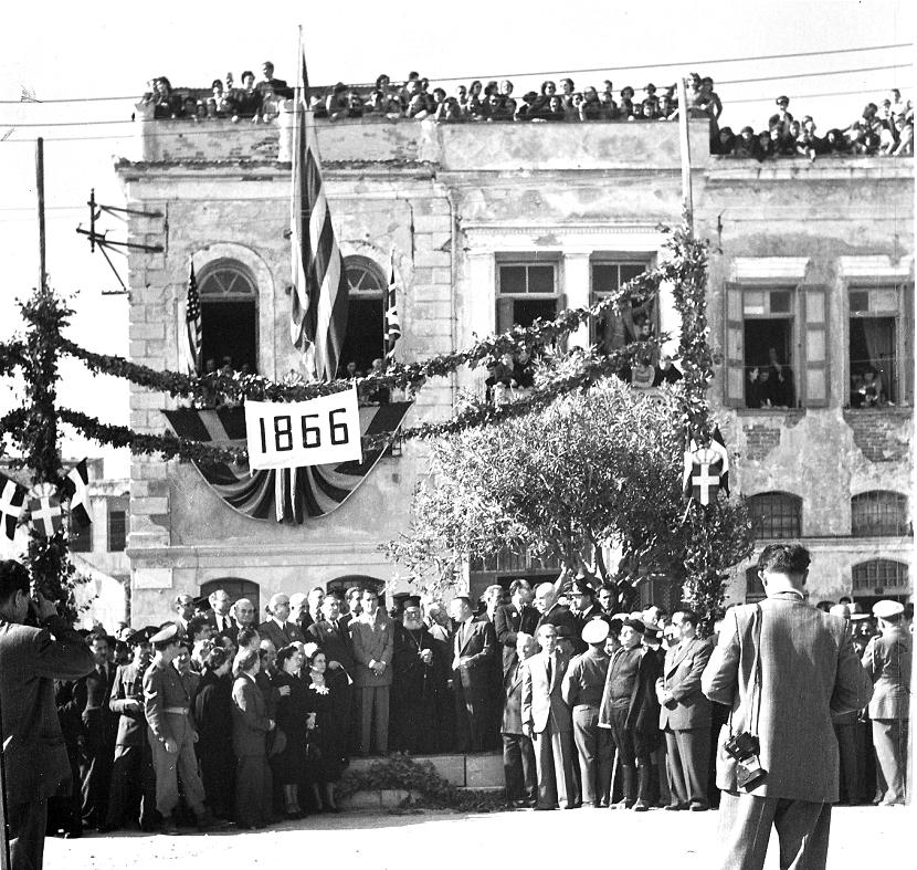 11. Στις παρελάσεις της Προκυμαίας οι επίσημοι συγκεντρώνονταν μπροστά και πάνω στο κτήριο του (παλιού) Δημαρχείου, όπως σ’ αυτή εδώ τη φωτογραφία, που τραβήχτηκε πριν από το έτος 1964, όταν ο Σοφοκλής Βενιζέλος, που μόλις διακρίνεται, είχε αφιχθεί στο Ρέθυμνο μαζί με τον Αμερικανό εν Ελλάδι πρέσβη και επίσημους κρατικούς φωτογράφους, που διακρίνονται αριστερά και δεξιά.