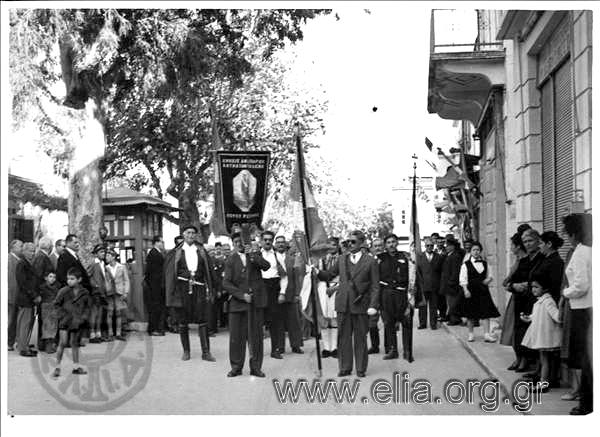 12. Η διπλανή φωτογραφία, από ταχυδρομική κάρτα που έχει διασωθεί στο ΕΛΙΑ, παρατίθεται όχι επειδή παρουσιάζει ένα από τα σωματεία της πόλης με τα λάβαρα και τις σημαίες του, τέτοια είδαμε πολλά. Παρουσιάζεται εδώ επειδή το τοπίο της είναι κατά πολύ διαφορετικό από το σημερινό. Οπωσδήποτε είναι τραβηγμένη στη Λεωφόρο Κουντουριώτη, στο ύψος του Γυμνασίου Θηλέων και το κενό στο βάθος δεξιά είναι εκείνο της πλατείας Τεσσάρων Μαρτύρων.