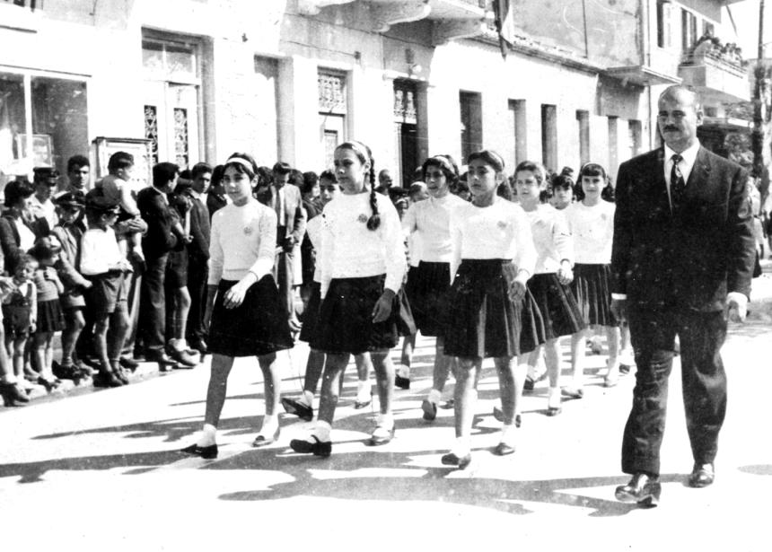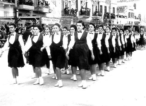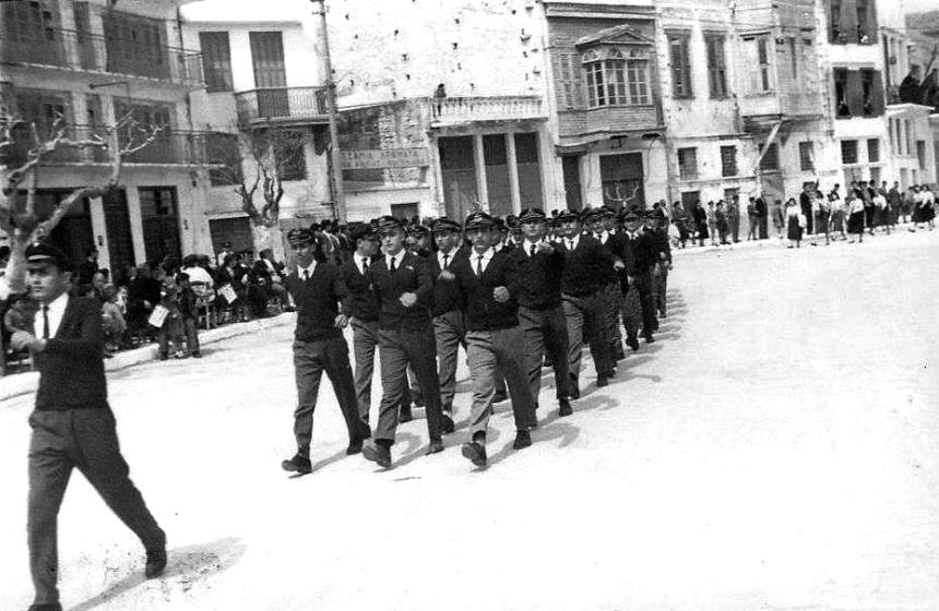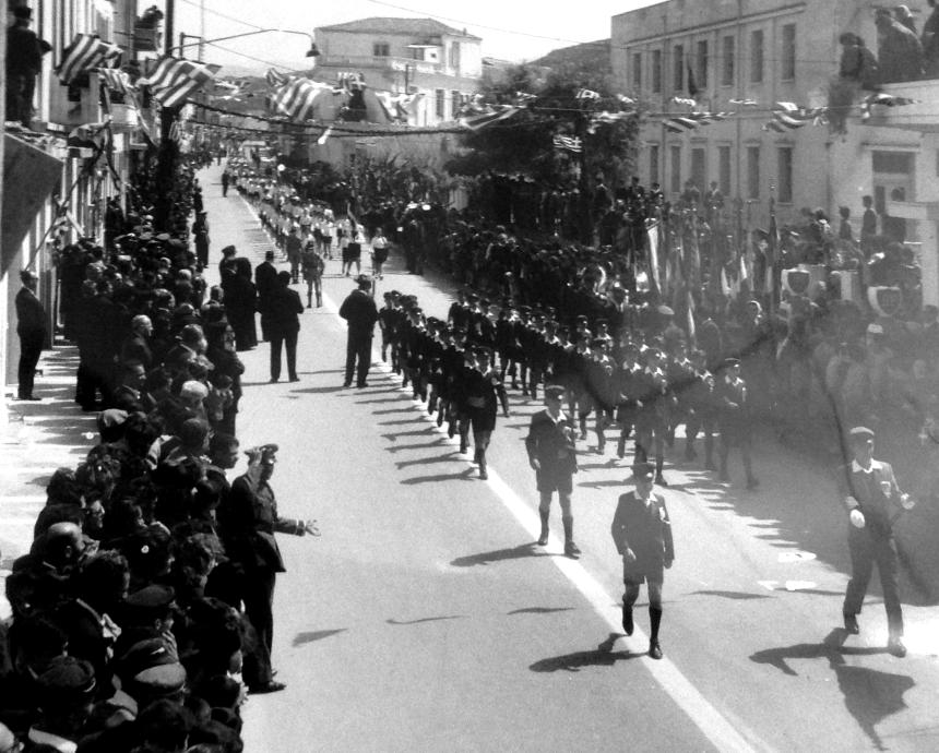 14. Την παράταξη των επισήμων μπροστά στα φωτογραφεία (που έκαναν χρυσές δουλειές σ’ αυτές τις περιστάσεις) επιβεβαιώνει και η διπλανή φωτογραφία, η αξία της οποίας όμως έγκειται περισσότερο στο ότι δείχνει την τελευταία παρέλαση των μαθητών του ιδιωτικού σχολείου «Αθηνά», το 1964. Από το επόμενο έτος το ιστορικό «Σχολείο της Κυρίας Αμαλίας» έπαψε να λειτουργεί.