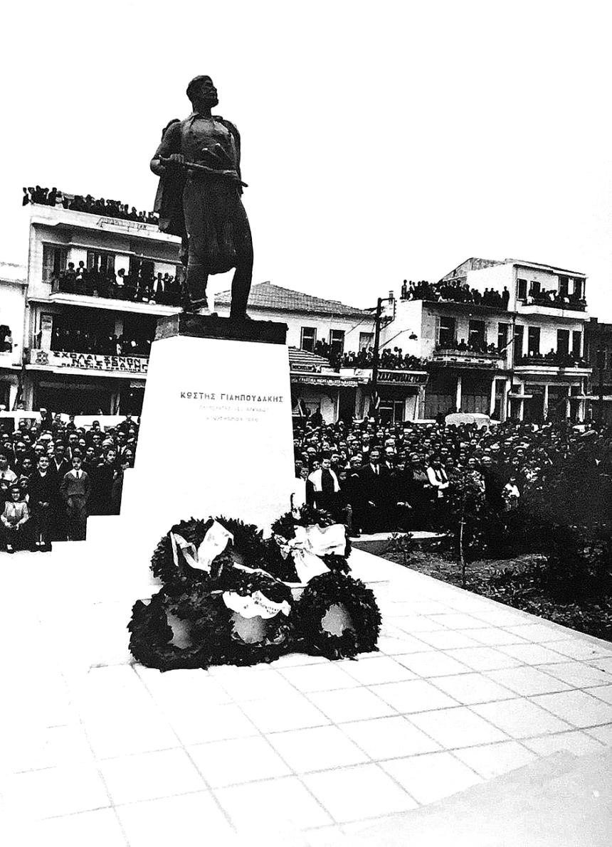 17. Από το έτος 1966 οι εορτασμοί της ολοκαύτωσης του Αρκαδίου πραγματοποιούνταν στη Λεωφόρο. Οι καταθέσεις γίνονταν πια στον ανδριάντα του Κωστή Γιαμπουδάκη, έργο του συμπολίτη γλύπτη Γιάννη Κανακάκη. Η φωτογραφία είναι πολύ πιθανόν να απαθανατίζει τα εγκαίνια του μνημείου.