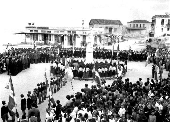 2. Συνεχίζω λοιπόν με μια φωτογραφία του 1959. Το έτος αυτό η κατάθεση στεφάνων πραγματοποιήθηκε κλασικά στο μνημείο του Άγνωστου Στρατιώτη. Πίσω από το «Κύμα» διακρίνεται η οικία Πετυχάκη (ήδη τότε Γιώργη Παπαδάκη) και απέναντι το «Πυθαγόρειον Λύκειον» του Γεράσιμου Μιχελιουδάκη. Να σημειώσουμε ότι το σχολείο αυτό είχε ήδη συγχωνευτεί με το «Παλλάδειον Λύκειον» του Γιάννη Σπανογιάννη.