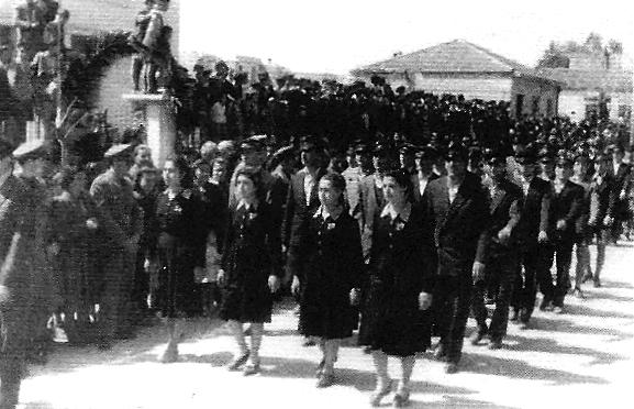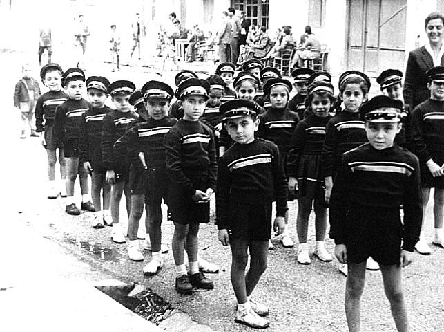 10. Ο μεγάλος πάντως αριθμός εκείνων που συμμετείχαν στις παρελάσεις απαρτιζόταν από τα δημοτικά σχολεία της πόλης. Πριν από τους συντεταγμένους μαθητές της πέμπτης και έκτης τάξης βάδιζε η εξάδα «της σημαίας», με κορυφαίο τον σημαιοφόρο της έκτης και τους εξ αριστερών και δεξιών παραστάτες του. Πίσω τους παρήλαυναν οι καλύτεροι μαθητές της πέμπτης τάξης.