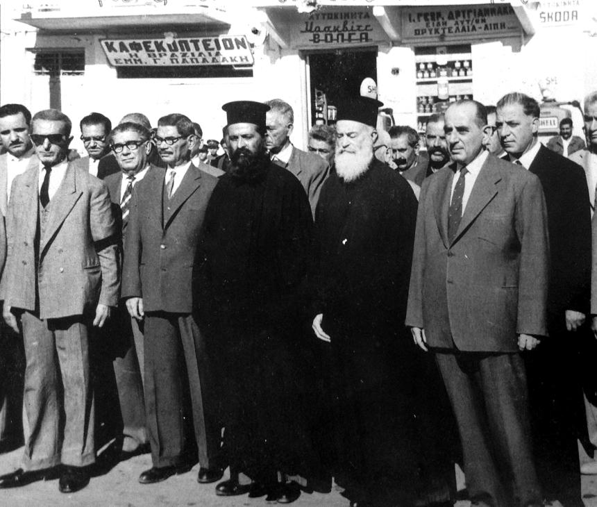 4. Από την κατάθεση στεφάνων του ίδιου αυτού έτους, 1960, είναι τραβηγμένη και η διπλανή φωτογραφία. Εκείνο που με έκανε να την επιλέξω είναι η παρουσία του μητροπολίτη Αθανάσιου Αποστολάκη, η οποία δεν ήταν συνηθισμένη σε τέτοιου είδους τελετές, αφού ο μακαριστός επικαλούνταν για τις απουσίες του τα προβλήματα υγείας που αντιμετώπιζε.
