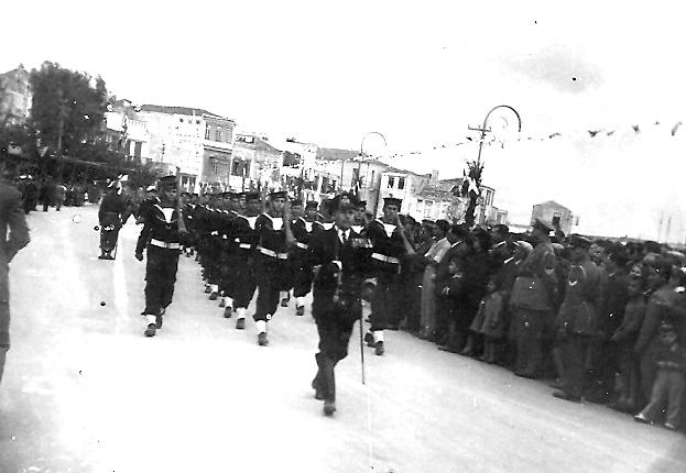 3. Από τους εορτασμούς του επόμενου έτους είναι τραβηγμένη η διπλανή φωτογραφία. Οι παρελάσεις πραγματοποιούνταν ακόμα στην Προκυμαία, από την οποία διακρίνεται η επιγραφή «Μοντέρνο Κέντρο Ανυφαντάκη». Προβληματισμό προκαλεί η ποδιά που φορούν οι μαθήτριες του Γυμνασίου Θηλέων, η οποία δεν είναι η γνωστή κλασική, μαύρη, που θα δούμε παρακάτω σε άλλες φωτογραφίες.