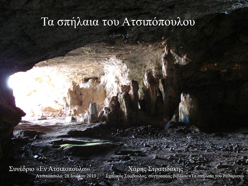 1.Τον Ιούλιο του 2013 πραγματοποιήθηκε στο Ατσιπόπουλο ένα αξιόλογο Συνέδριο, με τον τίτλο «Εν Ατσιποπούλω». Στις 28 του μήνα εκείνου πραγματοποίησα σ’ αυτό μια εισήγηση, που την τιτλοφόρησα «Τα σπήλαια του Ατσιπόπουλου». Ο διοργανωτής του Συνεδρίου Πολιτιστικός Σύλλογος δεν προχώρησε στη συνέχεια στην έκδοση Πρακτικών, καθήκον το οποίο προσπάθησε να αναπληρώσει με την κυκλοφορία των βιντεοσκοπημένων ανακοινώσεων με τη μορφή ενός συμπαγούς δίσκου (cd). Θυμίζω ότι στη μη έκδοση Πρακτικών τον ακολούθησε η Ομοσπονδία Αμαριωτών, που διοργάνωσε Συνέδριο για την τέως επαρχία Αμαρίου, πλην ενός τόμου, τον οποίο επιμελήθηκε και επιβαρύνθηκε ο αείμνηστος Στέργιος Μανουράς. Οι σημερινές λοιπόν και οι επόμενες «Ιστορικές περιηγήσεις» φιλοξενούν την εισήγησή μου εκείνη, χωρίς τις υποσημειώσεις και παραπομπές της, συμπεριλαμβάνοντας μικρό αριθμό από τις διαφάνειες που τη συνόδευαν.