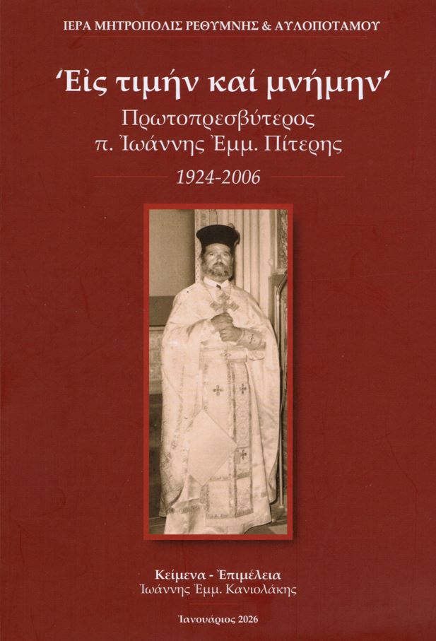 Πρόσφατα κυκλοφόρησε το βιβλίο «Εις τιμήν και μνήμην», αφιερωμένο στον αείμνηστο πρωτοπρεσβύτερο παπα-Γιάννη Πίτερη (1924–2006), που επιμελήθηκε ο κ. Ιωάννης Εμμ. Κανιολάκης, συνταξιούχος θεολόγος καθηγητής και τέως διευθυντής του 3ου Γυμνασίου Ρεθύμνου. Πρόκειται για μια έκδοση μνημονικού και τεκμηριωτικού χαρακτήρα, η οποία φιλοδοξεί να διασώσει, να ανασυνθέσει και να αναδείξει την προσωπικότητα και το πολυσχιδές έργο ενός σημαντικού κληρικού της τοπικής μας Εκκλησίας.