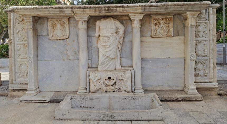 Τρίτον, μου έδειξαν τον ναό του Κρόνου –που είναι ένα έργο αξιοθαύμαστο, τόσο μεγάλης αρχαιότητας και όμως ακόμη άφθαρτο– ο οποίος (όπως λένε) ήταν ο πρώτος βασιλιάς που κατοίκησε εκεί και πατέρας του Δία. Και κοντά σε αυτόν, βρίσκεται ο κατεδαφισμένος ναός της Ματελία, που φέρει αυτή την επιγραφή πάνω από την πόρτα, η οποία διακρίνεται ακόμη: «Καθαρίστε τα πόδια σας, πλύνετε τα χέρια σας και εισέλθετε.» [14]