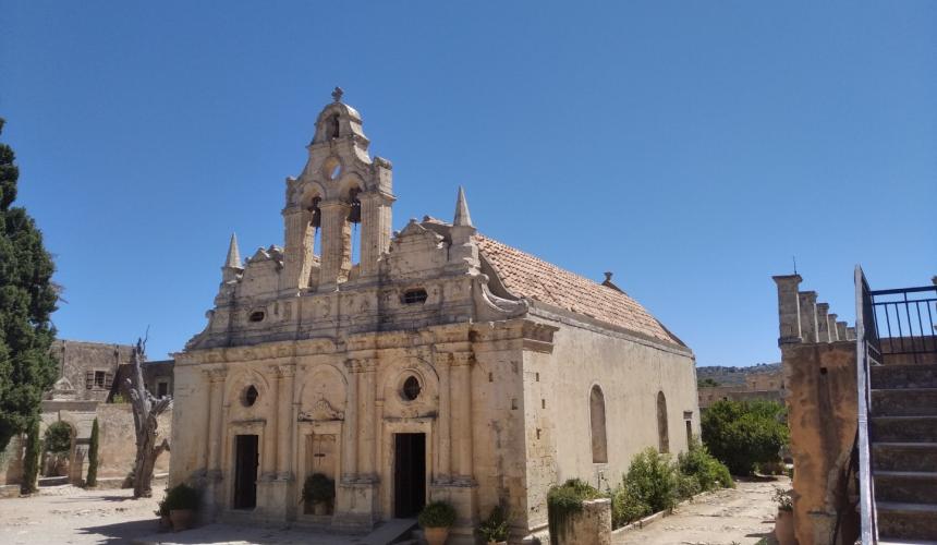 Το ίδιο το μοναστήρι είχε δύο ωραίες αυλές, η μικρότερη από τις οποίες θα μπορούσε να είχε φιλοξενήσει οποιονδήποτε βασιλιά της Ευρώπης. Η εκκλησία ήταν μικρή, και ανάμεσα στους τέσσερις μοναχούς, υπήρχε μόνο ένας ιερέας της Θείας Λειτουργίας, όντας ένας Έλληνας, γεννημένος και γαλουχημένος στον Ρωμαιοκαθολικισμό. Το νέο του όνομα ήταν «Πατέρας Matecarras», γνωστός επίσης ως «Πάτερ Ευχαρίστως» [στο πρωτότυπο: Pater Libenter], ή «Πατέρας της ελεύθερης βούλησης», πράγματι ένα σωστό όνομα για έναν τόσο ανόητο τύπο, επειδή είχε τόσο γερό στομάχι που μπορούσε να δεχτεί δυνατά ποτά χωρίς πρόβλημα, και κατά το διάστημα των είκοσι ημερών της παραμονής μου εκεί, ποτέ δεν είδα αυτόν, ούτε κανέναν από τους άλλους τρεις πραγματικά νηφάλιο. Πολλά παράξενα γλέντια και αστεϊσμούς έχω παρατηρήσει σε αυτούς τους μοναχούς της Κρήτης, αλλά ο χρόνος δεν μου επιτρέπει να τους εξιστορήσω, αφήνοντας τα υπόλοιπα στην ιδιωτική μου συνομιλία, δίνοντας μια δεκάρα για την ανοησία τους.