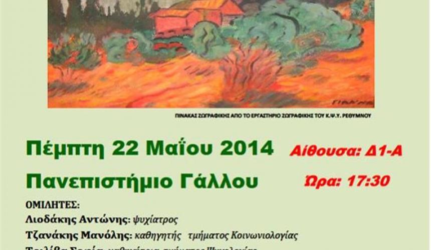 Στο πλαίσιο των δραστηριοτήτων του το Κέντρο Ψυχικής Υγείας Ρεθύμνου(Κ.Ψ.Υ. Ρ.),και οι φοιτητές πρακτικής άσκησης του Πανεπιστημίου Κρήτης , οργανώνουν ενημερωτική εκδήλωση με θέμα: «Ψυχική υγεία: χθες, σήμερα, αύριο».