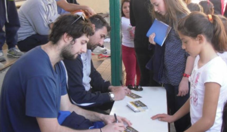 Ο team manager της ομάδας Γιώργος Κούμουλος με τους παίκτες μας Άκη Καλλινικίδη, Ανδρέα Κανονίδη, Γιάννη Σίνη που τους συνόδευαν ο βοηθός προπονητή Σταύρος Μυκονιάτης, η Φωτεινή Παπαδοπετράκη από το τμήμα Μάρκετινγκ και Δημοσίων Σχέσεων και ο Τζανιδάκης Νίκος από το Γραφείο Τύπου επισκέφθηκαν το 15ο Δημοτικό σχολείο Ρεθύμνου όπου μικροί μαθητές και δάσκαλοι τους υποδέχτηκαν με ενθουσιασμό.