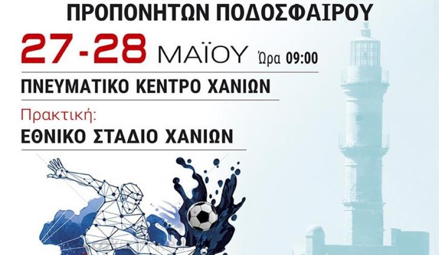 Με την στήριξη της Περιφέρειας Κρήτης, της Περιφερειακής Ενότητας Χανίων, των Δήμων Χανίων, Πλατανιά, η Ε.Π.Σ. Χανίων, ο σύνδεσμος προπονητών Χανίων και η Πανελλήνια Ένωση Προπονητών Ποδοσφαίρου συνδιοργανώνουν το διεθνές επιμορφωτικό σεμινάριο προπονητών ποδοσφαίρου στις 27 και 28 Μαΐου στις 9 το πρωί στο Πνευματικό Κέντρο Χανίων (θεωρητικό μέρος) και στο Εθνικό Στάδιο Χανίων (πρακτικό μέρος) . Όπως αναφέρουν οι διοργανωτές, οι προπονητές είναι ένας από τους σημαντικούς πυλώνες πάνω στους οποίους στηρίζεται το ποδόσφαιρο, και η Ένωση Προπονητών φροντίζει για την εκπαίδευση και την επιμόρφωση τους, καθώς οι προπονητές πέραν του ότι, διδάσκουν την τέχνη του ποδοσφαίρου, είναι και παιδαγωγοί, που διαπλάθουν τους χαρακτήρες των μικρών παιδιών, στο πλαίσιο του «ευ αγωνίζεσθε και της ευγενούς άμιλλας», αναδεικνύοντας ολοκληρωμένους ποδοσφαιριστές και συγχρόνως σωστούς φιλάθλους.