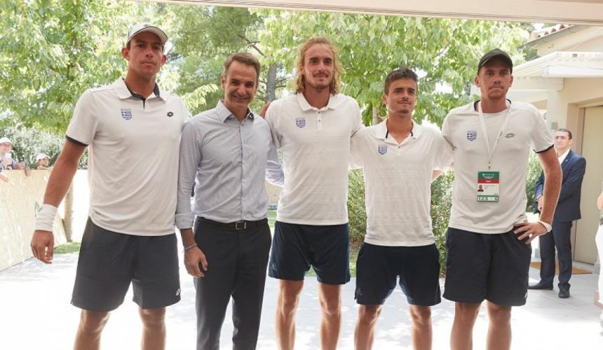 Ο αγώνας του Στέφανου Τσιτσιπά με τον Χούμπερτ Χουρκάτς μόλις είχε τελειώσει και ο πρωθυπουργός Κυριάκος Μητσοτάκης επισκέφθηκε το σημείο συγκέντρωσης της ελληνικής ομάδας λίγο πριν αρχίσει ο αγώνας του διπλού.
