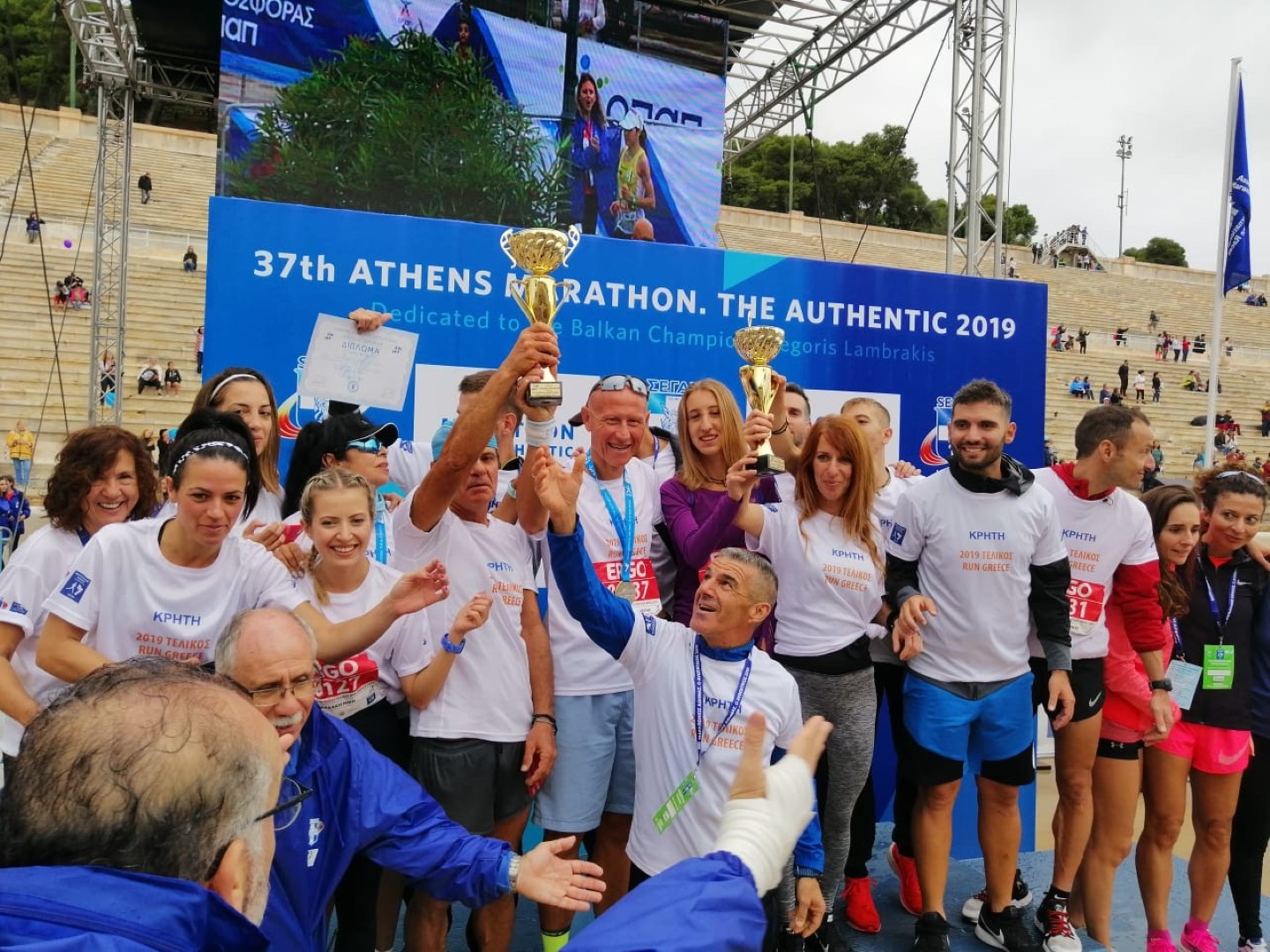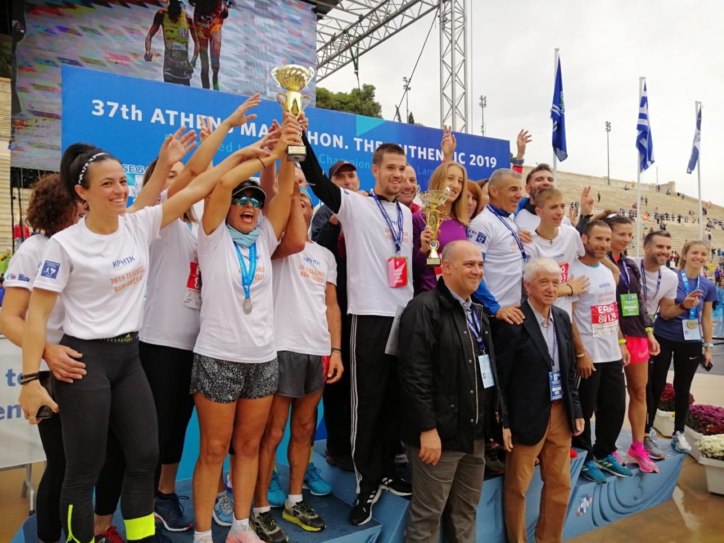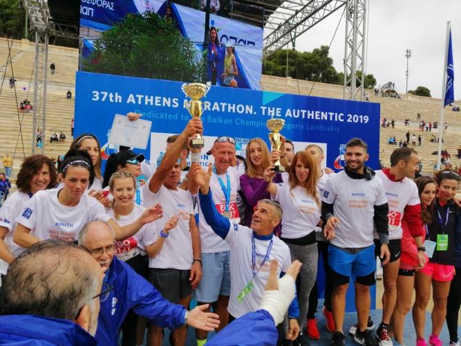 Την πρώτη θέση κατέλαβαν οι 10 άνδρες αθλητές της Κρήτης που αποτελούσαν την ομάδα της Περιφέρειας στον τελικό αγώνα του RUN GREECE 2019 που έγινε σήμερα Κυριακή στην Αθήνα στο πλαίσιο του αυθεντικού μαραθωνίου. Επάξια τους μιμήθηκαν και οι 10 γυναίκες αθλήτριες της κρητικής ομάδας ανεβαίνοντας κι εκείνες στο πρώτο σκαλί του βάθρου, πανηγυρίζοντας την απόλυτη πρωτιά της κρητικής ομάδας, η οποία σημειώθηκε ανάμεσα στους αθλητές επτά περιφερειών της χώρας που πήραν μέρος στον τελικό αγώνα του RUN GREECE 2019.