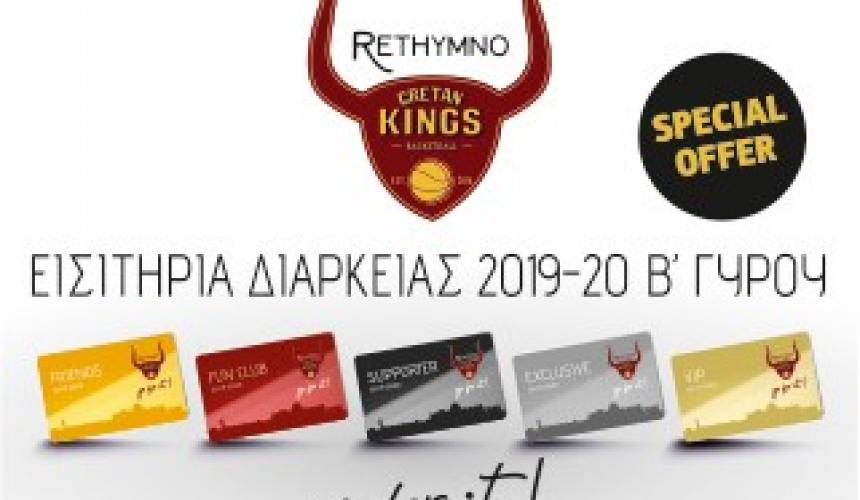 Η ΚΑΕ Ρέθυμνο Cretan Kings ενημερώνει τους φιλάθλους της ότι από σήμερα 30 Δεκεμβρίου κυκλοφορούν τα εισιτήρια διαρκείας για τον β’ γύρο της ΕΚΟ Basket League με έκπτωση.