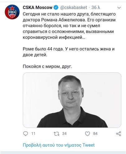 Ο Ρόμαν Αμπζελίλοφ εργαζόταν στην ΤΣΣΚΑ Μόσχας από το 2014,ενώ η ομάδα του Δημήτρη Ιτούδη μέσα από τον λογαριασμού της στο twitter έστειλε τα δικά της συλληπτήρια στην οικογένεια του άτυχου γιατρού.