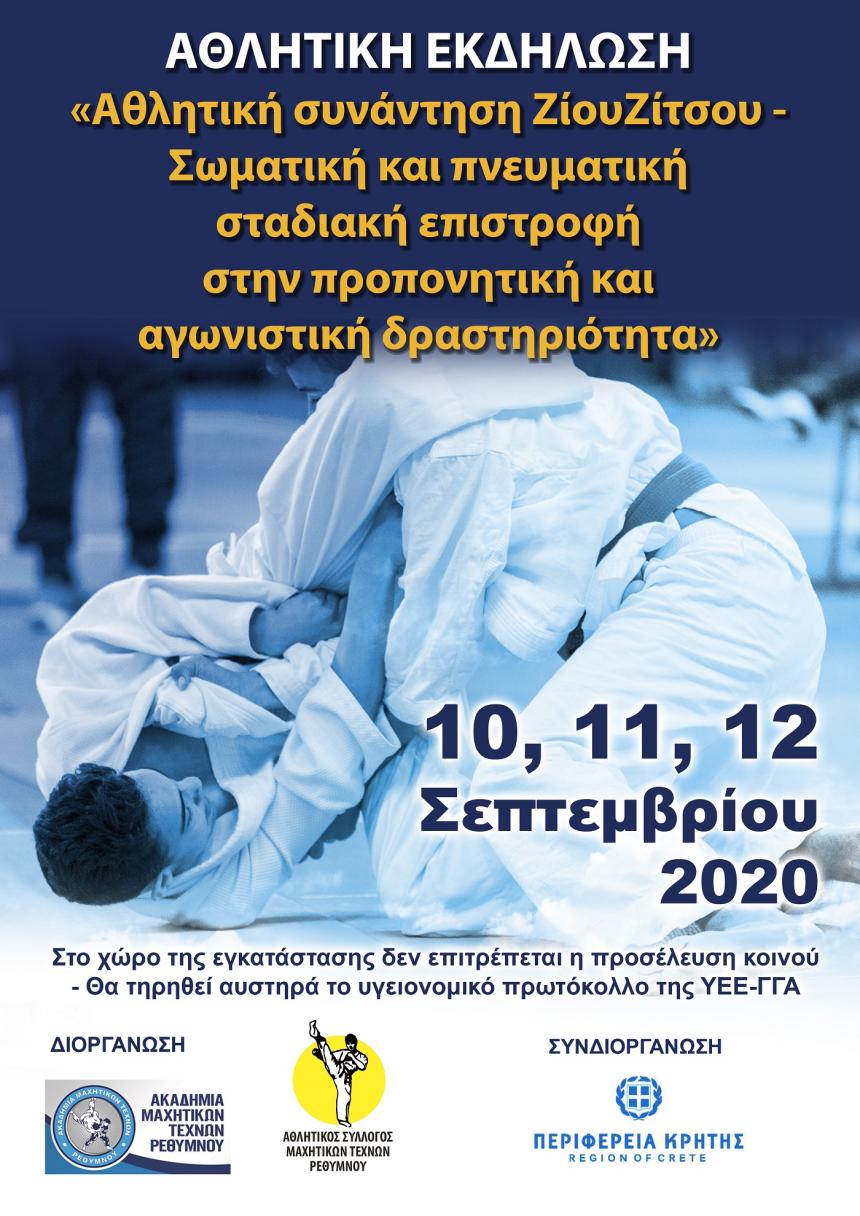 Με την συνδιοργάνωση της Περιφέρειας Κρήτης θα πραγματοποιηθεί η αθλητική εκδήλωση με τίτλο: « Αθλητική συνάντηση Ζίου Ζίτσου - Σωματική και πνευματική σταδιακή επιστροφή στην προπονητική και αγωνιστική δραστηριότητα», το τριήμερο 10, 11, 12 Σεπτεμβρίου 2020 στο Ρέθυμνο.
