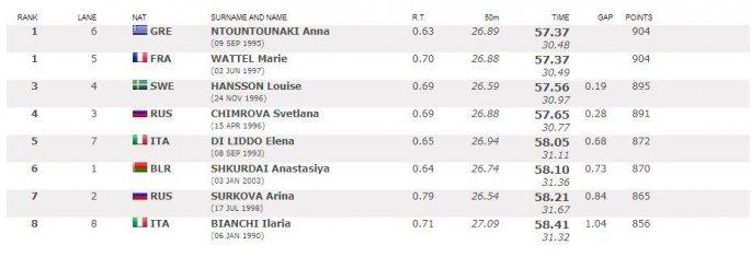 Η Ντουντουνάκη κολύμπησε τα 100 μ. πεταλούδα σε 57.37 συντρίβοντας το πανελλήνιο ρεκόρ. Η Χανιώτισσα αθλήτρια, η οποία ήδη έχει εξασφαλίσει τη συμμετοχή της στους Ολυμπιακούς Αγώνες του Τόκιο, γύρισε έκτη μετά τα πενήντα μέτρα αλλά ήταν άπιαστη στο δεύτερο 50άρι. Το 57.37 αποτελεί τον καλύτερο χρόνο όλων των εποχών στο αγώνισμα εντός συνόρων καθώς το προηγούμενο ρεκόρ κατείχε η ίδια με 57.77.