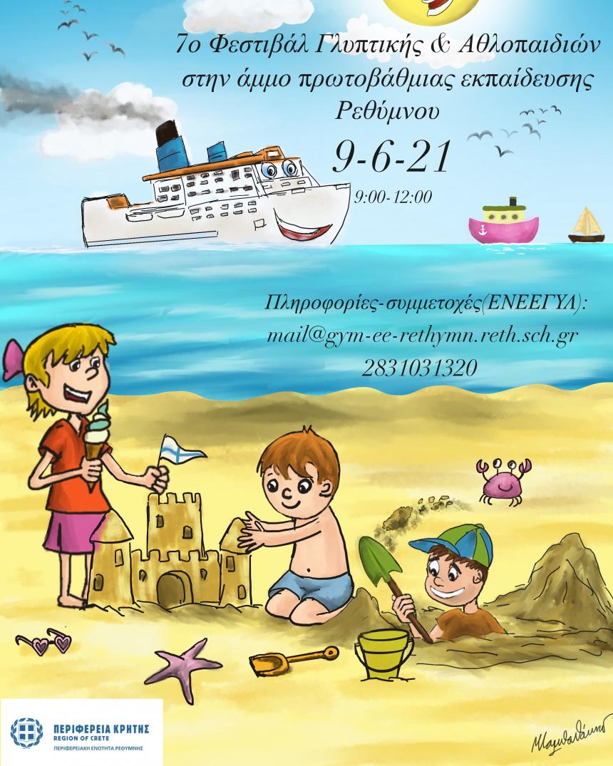 Στο πλαίσιο ανάπτυξης υγιούς & δημιουργικού μαθητικού πνεύματος στην εκπαιδευτική κοινότητα με στόχο την καταπολέμηση του σχολικού εκφοβισμού,το Ενιαίο Ειδικό Επαγγελματικό Γυμνάσιο-Λύκειο Ρεθύμνου & η Περιφέρεια Κρήτης διοργανώνει το 7ο Φεστιβάλ Γλυπτικής στην άμμο & αθλοπαιδιών.