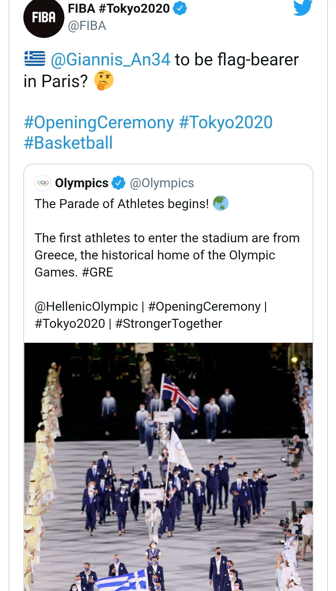 "Να είναι ο Γιάννης Αντετοκούνμπο σημαιοφόρος στο Παρίσι;" έγραψε χαρακτηριστικά η παγκόσμια ομοσπονδία στον επίσημο λογαριασμό της στο Twitter.