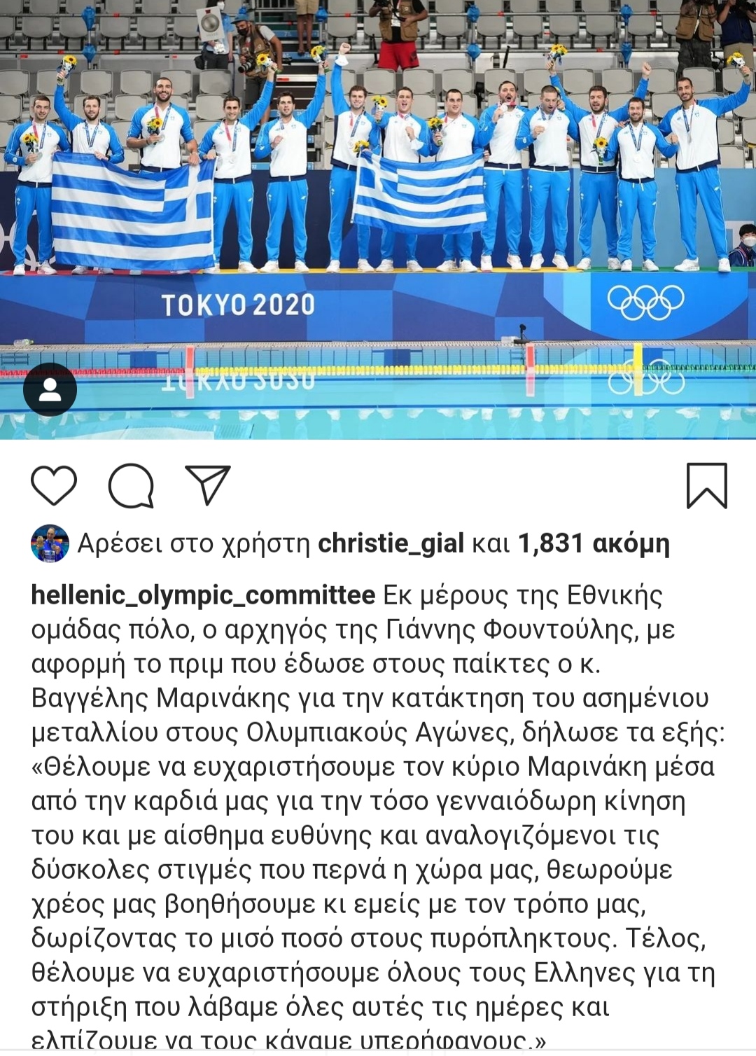«Θέλουμε να ευχαριστήσουμε τον κύριο Μαρινάκη μέσα από την καρδιά μας για την τόσο γενναιόδωρη κίνηση του και με αίσθημα ευθύνης και αναλογιζόμενοι τις δύσκολες στιγμές που περνά η χώρα μας, θεωρούμε χρέος μας βοηθήσουμε κι εμείς με τον τρόπο μας, δωρίζοντας το μισό ποσό στους πυρόπληκτους. Τέλος, θέλουμε να ευχαριστήσουμε όλους τους Ελληνες για τη στήριξη που λάβαμε όλες αυτές τις ημέρες και ελπίζουμε να τους κάναμε υπερήφανους.»