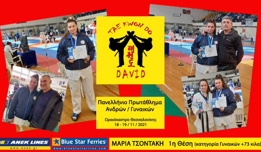 Η αθλήτρια του Αθλητικού Συλλόγου ΔΑΥΊΔ που εδρεύει στον Πλατανιά - Τσεσμέ Ρεθύμνου, ΤΣΟΝΤΑΚΗ ΜΑΡΙΑ συμμετείχε στο πανελλήνιο πρωτάθλημα Ταεκβοντο ανδρών/ γυναικών που πραγματοποιήθηκε στο Ωραιόκαστρο της Θεσσαλονίκης στις 18 - 19 / 11 / 2021. Η 18-χρόνη αθλήτρια, η οποία αν και μικρότερη ηλικιακά στην κατηγορία, κατάφερε να κατακτήσει την 1η θέση στην κατηγορία γυναικών + 73 κιλα , αποδεικνύοντας έτσι πως η θέση που έχει λάβει στην Εθνική Ομάδα του Ταεκβοντο της αξίζει και είναι αποτέλεσμα χρόνιας σκληρής προπόνησης , προσπάθειας και συνεχούς συμμετοχής σε αγώνες. Πολλά συγχαρητήρια αξίζουν στην Μαρία Τσοντάκη, καθώς εκτός από τις αθλητικές της διακρίσεις, καταφέρε επίσης φέτος να εισαχθεί και στο Παιδαγωγικό Τμήμα Δημοτικής Εκπαίδευσης Ρεθύμνου. Επόμενη στάση είναι το κύπελλο «Κωνσταντίνος Θωμαΐδης» (πανελλήνιας συμμετοχής) όπου η αθλήτρια θα δοκιμάσει νέες τακτικές με σκοπό την καλύτερη προετοιμασία για αγώνες στο εξωτερικό.