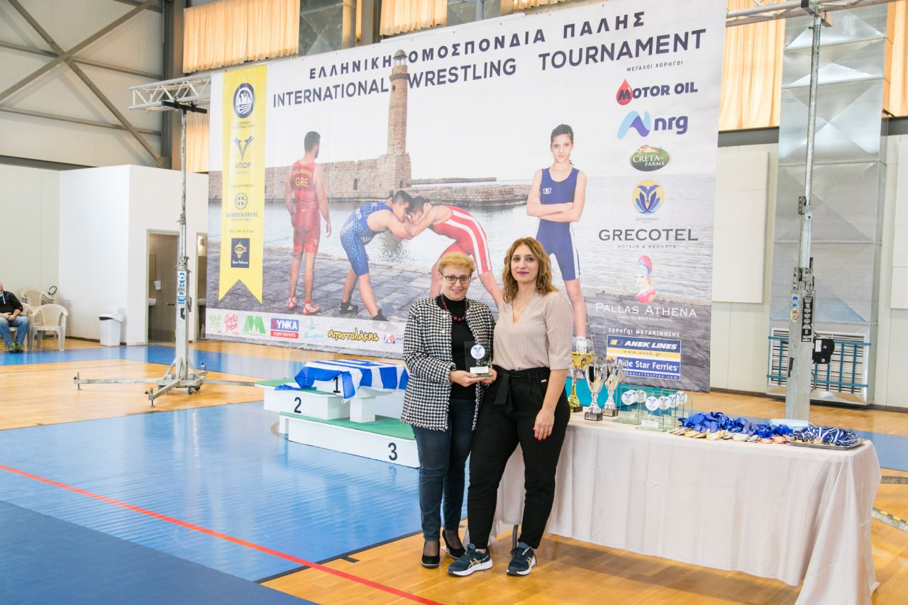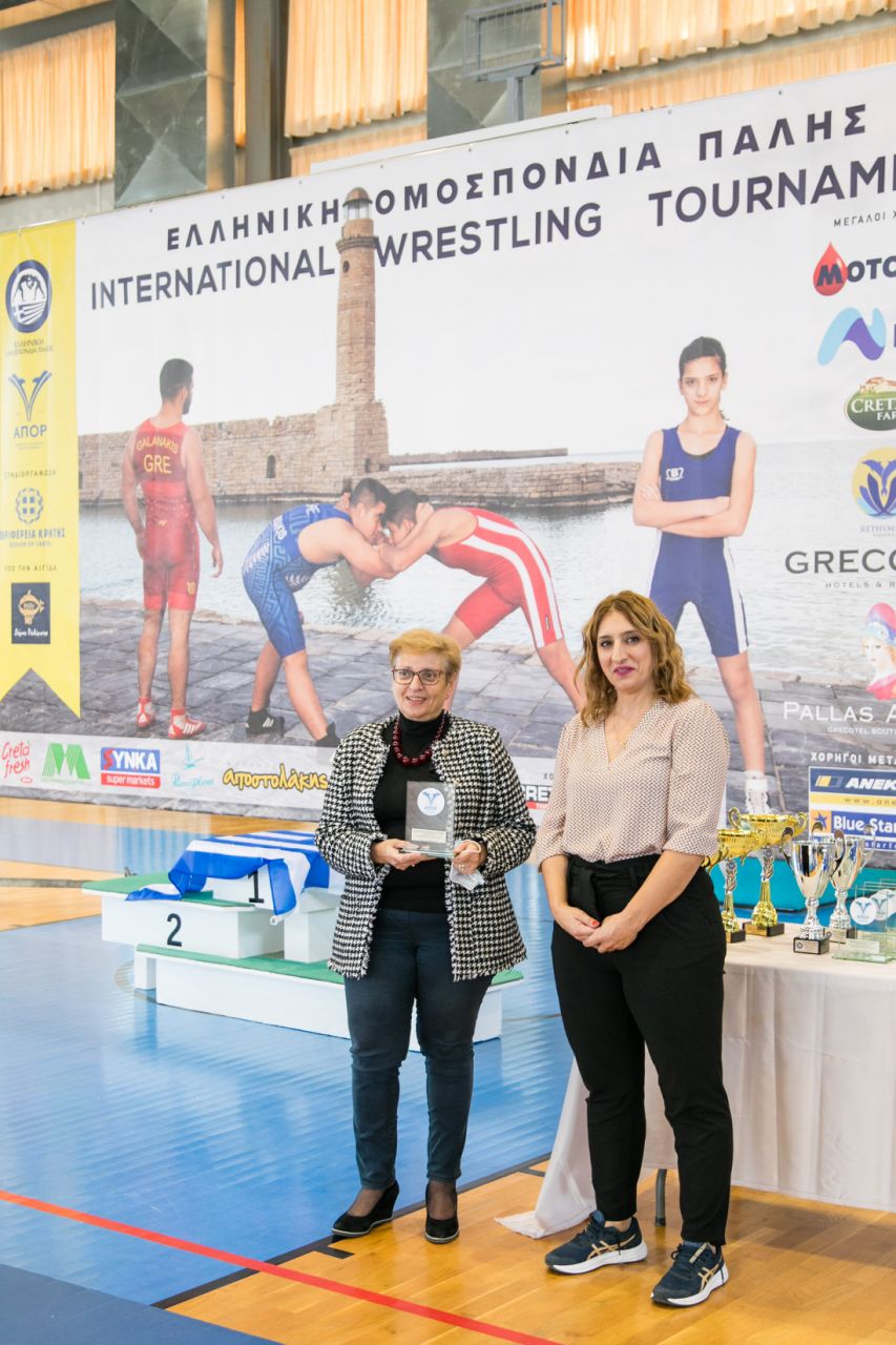 Η πρόεδρος του ΑΠΟΡ και μέλος τους ΔΣ της Ελληνικής Ομοσπονδίας Πάλης καλωσόρισε τις αποστολές και κάλεσε 7 μεταλλιούχους αθλητές από τις διεθνείς διοργανώσεις του 2021 μεταξύ τον οποίων και ο Βαλκανιονίκης αθλητής του ΑΠΟΡ Νίκος Καραβάνος και η Μολδαβή χάλκινη πρωταθλήτρια Ευρώπης Όλγα Πόποβα να κάνουν ένα βήμα μπροστά και το Ρέθυμνο τους τίμησε με το χειροκρότημα του. Η κα Παπαδάκη ευχαρίστησε θερμά τον Αντιπεριφερειάρχη Κρήτης κο Σταύρο Αρναουτάκη την Αντιπεριφερειάρχη Ρεθύμνου κα Μαρία Λιονή για την χρηματοδότηση των αγώνων και για την προμήθεια του αγωνιστικού τάπητα υψηλών προδιαγραφών και υποσχέθηκε στην Αντιπεριφερειάρχη πως «τη νέα παλαίστρα θα τη λιώσουμε στις προπονήσεις και στους αγώνες για να σας ξαναζητήσουμε καινούργια». Η κα Παπαδάκη αναφέρθηκε στη συμβολή του Δήμου για την παραχώρηση του γυμναστηρίου και για την συμβολή του στην άρτια διαμόρφωση του χώρου και ζήτησε από το Δήμαρχο μέριμνα για κατάλληλες υποδομές για την πάλη ώστε να διασφαλίζονται οι σωστές συνθήκες ασφάλειας και υγιεινής και για περισσότερους αθλητές και επικαλέστηκε πως πλέον έχουμε στο πλευρό μας για τους αγώνες μας και τον Υφυπουργό Αθλητισμού κο Αυγενάκη.