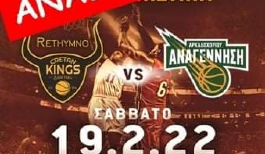 Η αυριανή αναμέτρηση του Ρεθύμνο Cretan Kings με την Αναγέννηση Αρκαλοχωρίου για την 14η αγωνιστική του πρωταθλήματος της ΕΚΑΣΚ αναβάλλεται λόγω των κρουσμάτων κορονοϊου που είχαν οι φιλοξενούμενοι.
