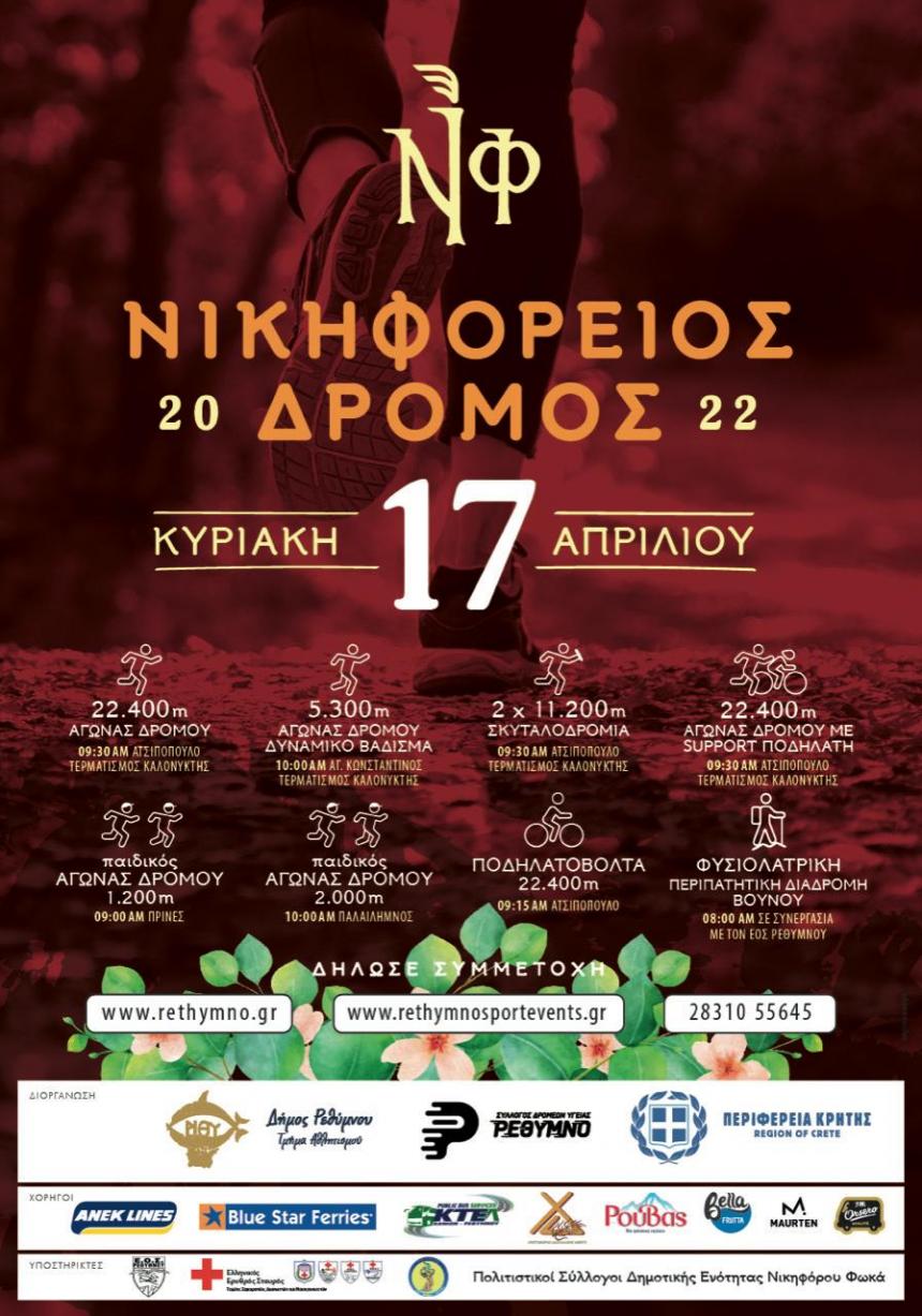 Ο πολυδιάστατος «Νικηφόρειος Δρόμος» επανέρχεται μετά από δύο χρόνια αγωνιστικής αδράνειας λόγω της πανδημίας. Το Τμήμα Αθλητισμού του Δήμου Ρεθύμνης και ο Σύλλογος Δρομέων Υγείας Ρεθύμνου με πολλούς υποστηρικτές διοργανώνουν, στις 17 Απριλίου 2022, τους 7ους Αγώνες «Νικηφόρειου Δρόμου» 2022, με πολλές αγωνιστικές διαδρομές για όλα τα γούστα, πλούσια δώρα και ειδική προνομιακή έκπτωση για όσους δρομείς «κλείσουν» τη συμμετοχή τους μέχρι τις 31 Μαρτίου.