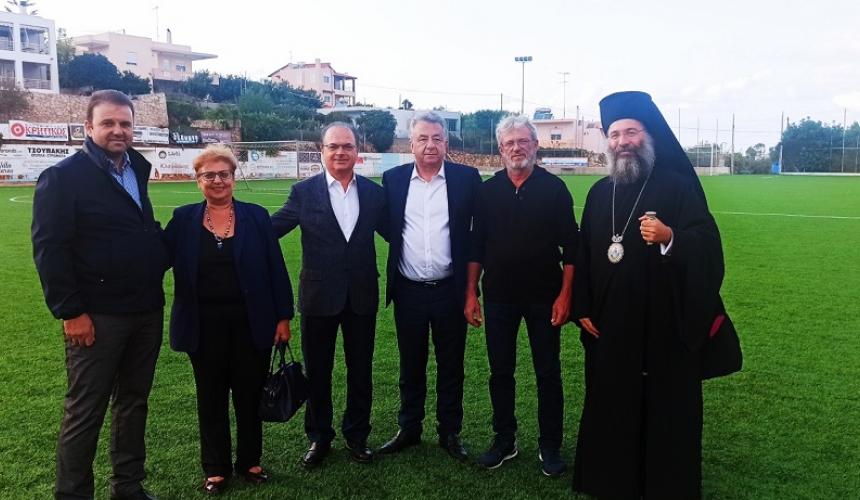 Όπως αναφέρθηκε από τους τοπικούς φορείς, ανακατασκευή του γηπέδου με νέο τάπητα και βελτίωση των εγκαταστάσεων για την άθληση των δυο ομάδων αλλά και εκατοντάδων νέων της περιοχής,ήταν επείγον θέμα που για την λύση του ανταποκρίθηκε άμεσα με χρηματοδότηση 300.000ευρώ, ο κ. Αρναουτάκης. Στο ρόλο του Αθλητισμού,στην αποκατάσταση και εκσυγχρονισμό του γηπέδου,αναφέρθηκαν στους χαιρετισμούς τους,ευχαριστώντας τον Περιφερειάρχη, ο Μητροπολίτης κ. Πρόδρομος, ο Βουλευτής Γιάννης Κεφαλογιάννης, η Αντιπεριφερειάρχης Μαρία Λιονή, ο Δήμαρχος Γιώργος Μαρινάκης, ο Πρόεδρος της τοπικής κοινότητας Ανδρέας Κλαψινός, όπως και με δηλώσεις τους, οι πρόεδροι των δυο ομάδων Νίκος Νικολακάκης, Δημήτρης Καπετανάκης, ο Γενικός Αρχηγός Κώστας Ασμαριανάκης, οι προπονητές,Κώστας Κλαψινός, Στέλιος Κοζανίδης κα.