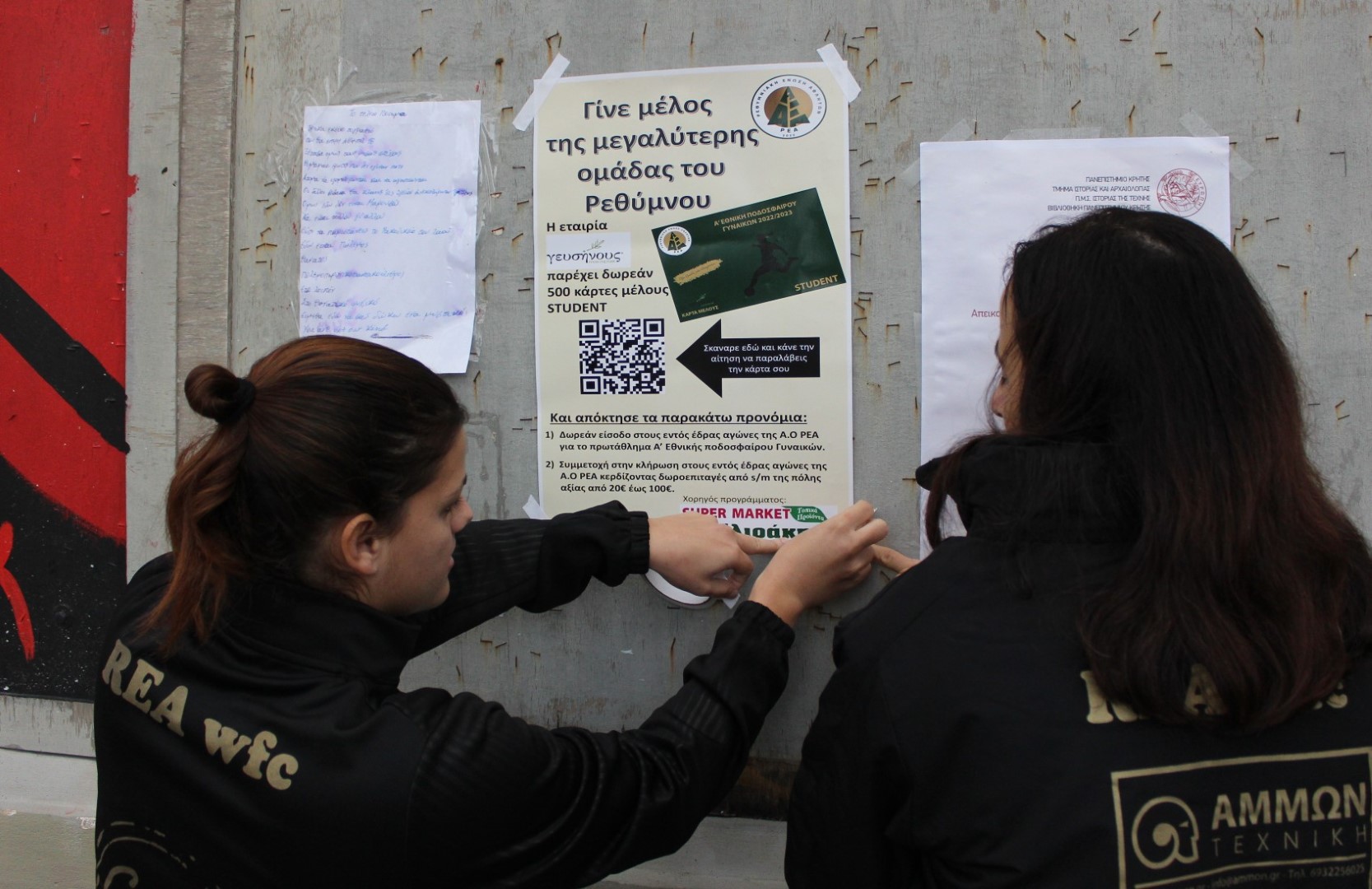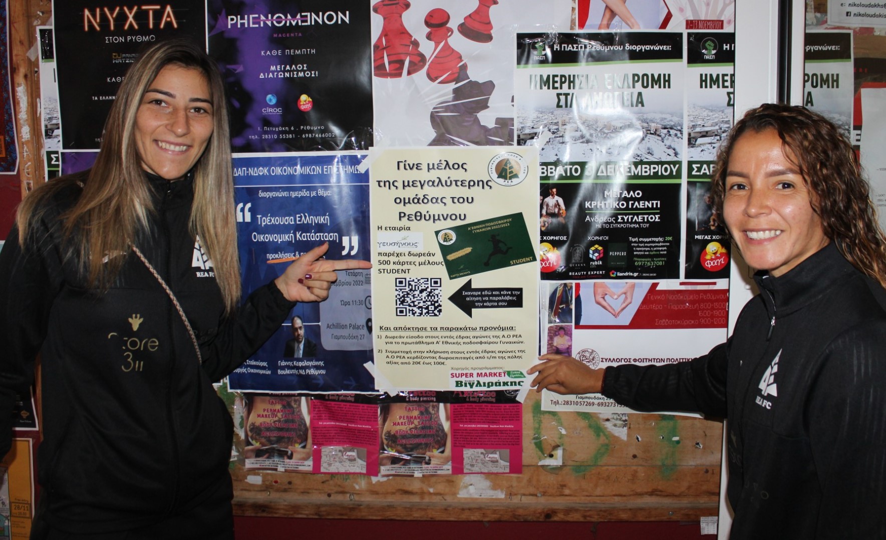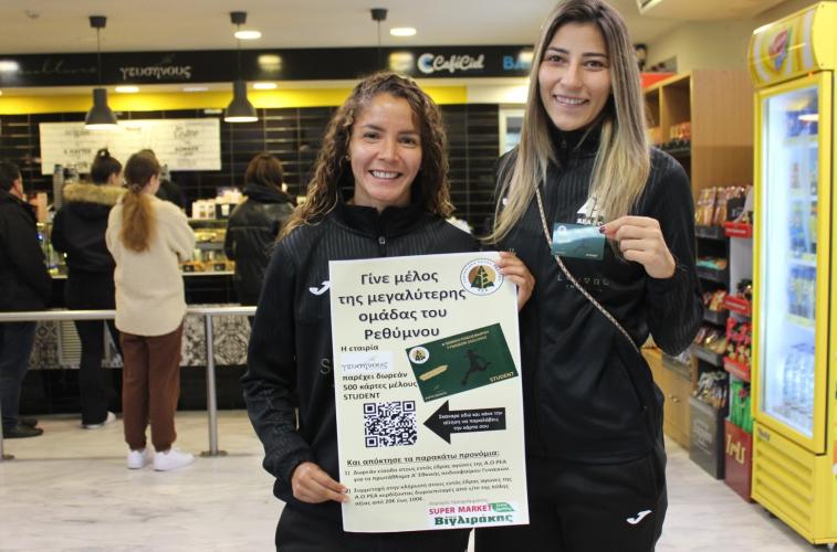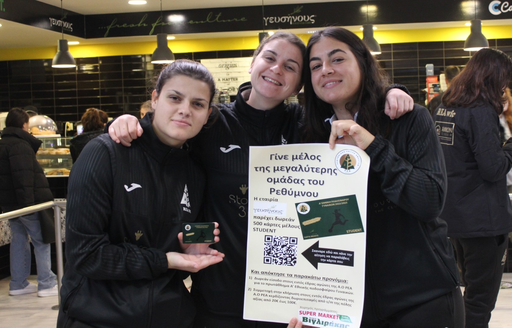 Η εταιρεία εστίασης ΓΕΥΣΗΝΟΥΣ δίνει την ευκαιρία σε 500 φοιτητές να γίνουν μέλη της Ρ.Ε.Α. ΔΩΡΕΑΝ, να παρακολουθήσουν όλους τους εντός έδρας αγώνες στη Women’s Football League και να διεκδικούν, κάθε εβδομάδα, μία δωροεπιταγή αξίας 20-100 ευρώ από το Super Market ΒΙΓΛΙΡΑΚΗΣ (έναντι νοσοκομείου).