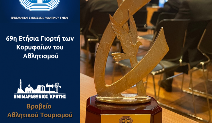 Μεγάλη τιμή για τον Ημιμαραθώνιο Κρήτης και τον Αθλητικό Σύλλογο Υγείας Αρκαλοχωρίου η απονομή του βραβείου Αθλητικού Τουρισμού στην 69η Ετήσια Γιορτή των Κορυφαίων του Πανελλήνιου Συνδέσμου Αθλητικού Τύπου που έλαβε χώρα την Τρίτη 20 Δεκεμβρίου στο Μέγαρο Μουσικής