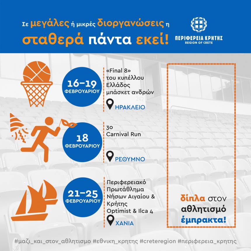 Σημαντικές διοργανώσεις πραγματοποιούνται τις προσεχείς ημέρες στην Κρήτη, με την στήριξη της Περιφέρειας Κρήτης. Από σήμερα 16 Φεβρουαρίου έως και τις 19 Φεβρουαρίου θα πραγματοποιηθεί στο νέο κλειστό γυμναστήριο Ηρακλείου «Δύο Αοράκια» το «Final 8» του κυπέλλου Ελλάδος μπάσκετ ανδρών. Το Σάββατο 18 Φεβρουαρίου 2023 θα πραγματοποιηθεί στο Ρέθυμνο το 3o Carnival Run. Από τις 21 Φεβρουαρίου έως και τις 25 Φεβρουαρίου θα λάβει χώρα στα Χανιά το Περιφερειακό Πρωτάθλημα Νήσων Αιγαίου & Κρήτης Optimist & Ilca 4.