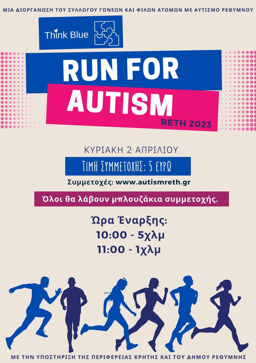 Ο Σύλλογος Γονέων Κηδεμόνων και Φίλων Ατόμων με Αυτισμό Ρεθύμνου υπό την αιγίδα της Περιφερειακής Ενότητας Ρεθύμνου και την υποστήριξη του Δήμου Ρεθύμνου, διοργανώνει στα πλαίσια της Παγκόσμιας Ημέρας Ευαισθητοποίησης για τον Αυτισμό, το πρωί της Κυριακής 2 Απριλίου 2023, στην Πλατεία Αγνώστου Στρατιώτη, δύο (2) αγώνες δρόμου για αθλητές, μη αθλητές και παιδιά.