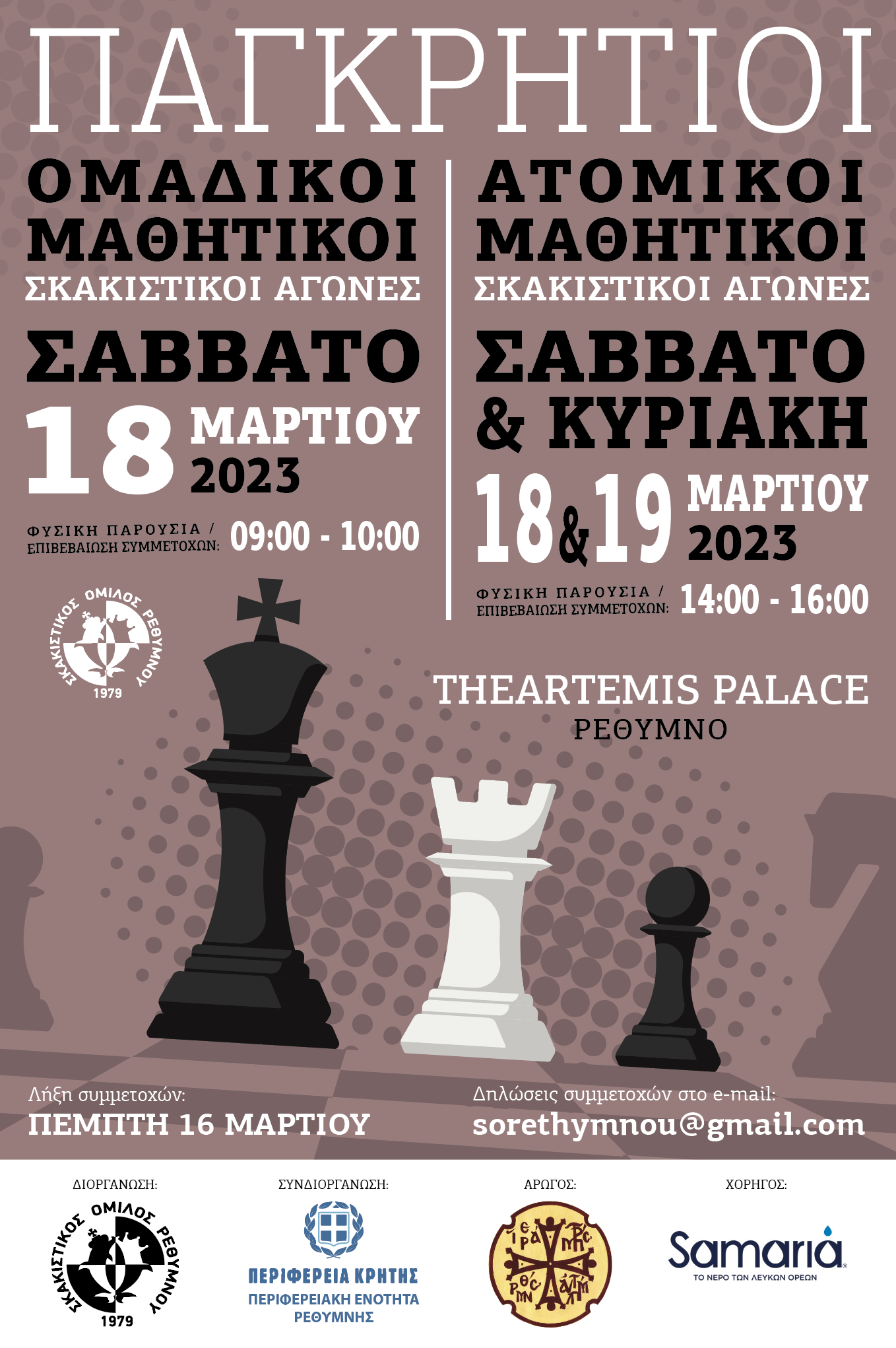 Το Σαββατοκύριακο 18 & 19 Μαρτίου 2023 φιλοξενήθηκε για δεύτερη συνεχόμενη χρονιά στο Ρέθυμνο η μεγαλύτερη σκακιστική διοργάνωση του νησιού μας, το Παγκρήτιο Μαθητικό Ατομικό Πρωτάθλημα Σκάκι με συμμετέχοντες μαθητές όλων των μαθητικών βαθμίδων του νησιού, από Προνήπια έως και Γ΄ Λυκείου!
