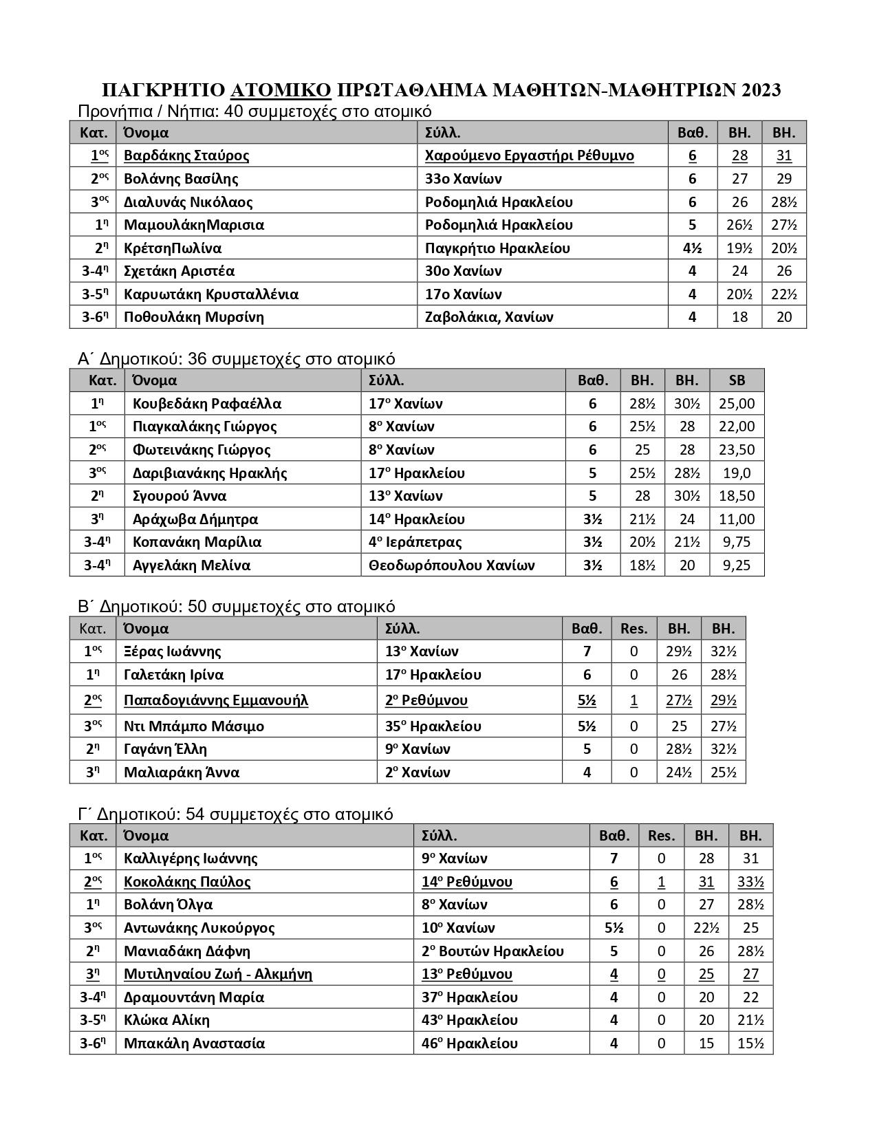3η | Κοτσυφάκη Δανάη | 1144 | 2ο Ηρακλείου | 4 | 0 | 24½ | 26½ |