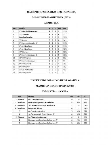 ΠΑΓΚΡΗΤΙΟ ΟΜΑΔΙΚΟ ΠΡΩΤΑΘΛΗΜΑ ΜΑΘΗΤΩΝ-ΜΑΘΗΤΡΙΩΝ (2023) ΓΥΜΝΑΣΙΑ – ΛΥΚΕΙΑ (50 συμμετοχές μαθητών στο ομαδικό) |