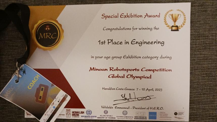 στο Ηράκλειο 7-10 Απριλίου στην κατηγορία excibition και πήρε την πρώτη θέση ειδικό βραβείο Μηχανικής. Η ομάδα με την καθοδήγηση της δασκάλας τους Μυρσίνης Σταυρακάκη παρουσίασαν δύο projects ,ένα βοηθό τάξης και ένα βοηθό αγορών Super Market,αποσπώντας ξεχωριστή διάκριση.