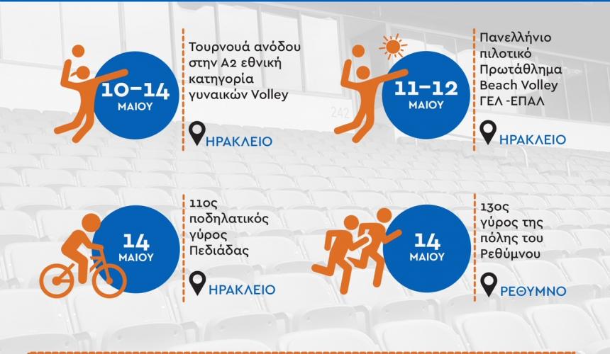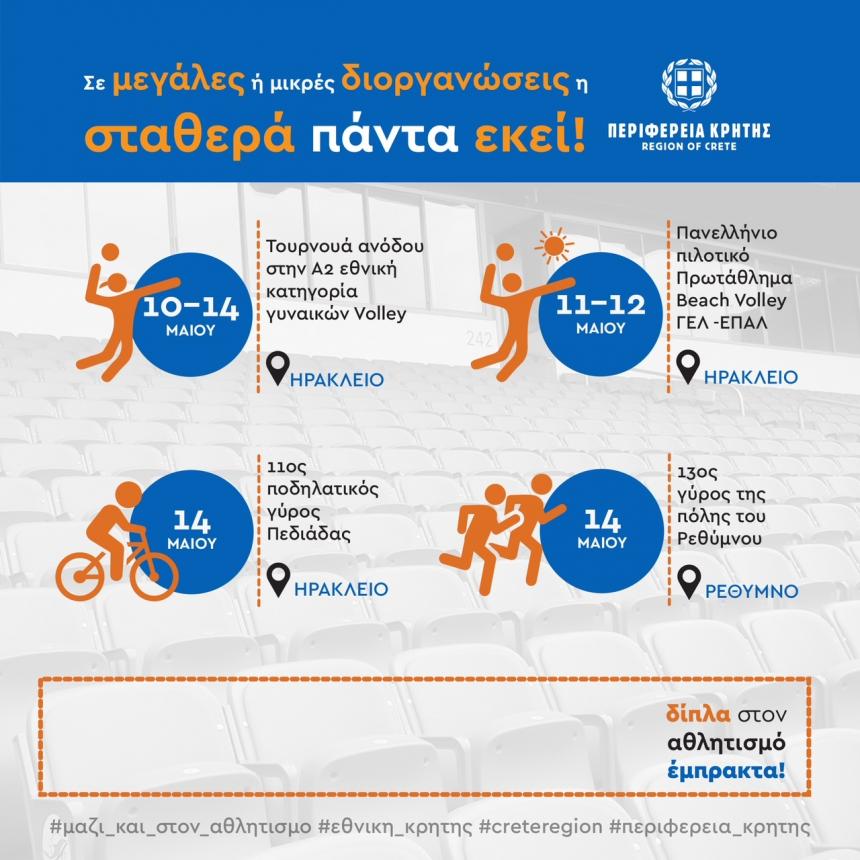 Σημαντικές διοργανώσεις πραγματοποιούνται τις προσεχείς ημέρες στην Κρήτη, με την στήριξη της Περιφέρειας Κρήτης. Από τις 10 έως τις 14 Μαΐου θα πραγματοποιη-θεί στο κλειστό γυμναστήριο του Βαρδινογιάννειου αθλητικού κέντρου Ηράκλειου, το τουρνουά ανόδου στην Α2 εθνική κατηγορία γυναικών βόλεϊ. Στις 11 και 12 Μαΐου θα πραγματοποιηθεί στις αθλητικές εγκαταστάσεις στην περιοχή του Καρτερού το Πα-νελλήνιο πιλοτικό πρωτάθλημα Βeach Volley μαθητών ΓΕΛ -ΕΠΑΛ . Στις 14 Μαΐου θα πραγματοποιηθεί ο «11ος ποδηλατικός γύρος Πεδιάδας» με την εκκίνηση να δίδεται στο κτίριο του πολιτιστικού συλλόγου του χωριού Αποστόλων Πεδιάδας. Την ίδια η-μέρα, στις 14 Μαΐου θα πραγματοποιηθεί στο Ρέθυμνο ο «13ος γύρος της πόλης του Ρεθύμνου».