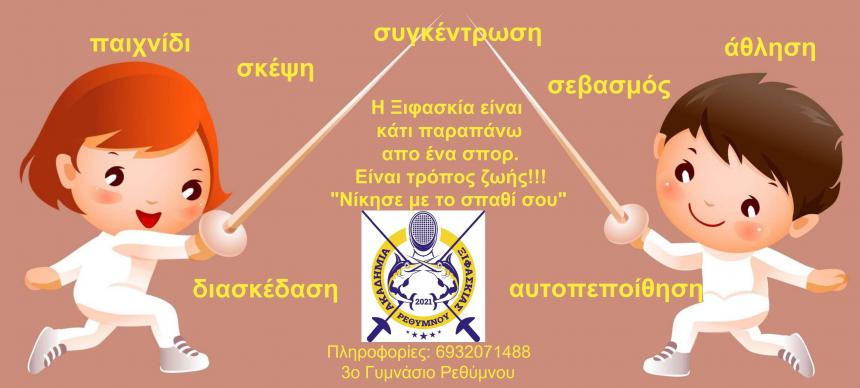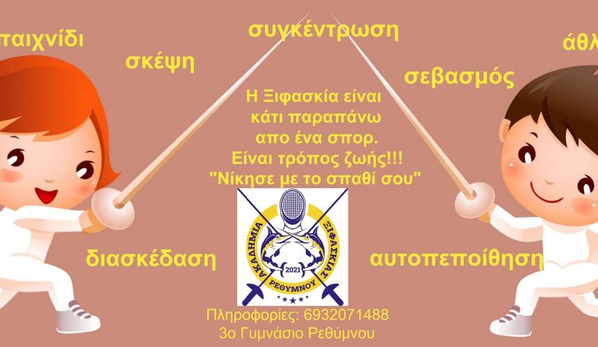 Τον τελευταίο χρόνο βλέπουμε στο κέντρο του Ρεθύμνου, να κυκλοφορούν κάποια παιδιά κρατώντας στα χέρια ένα σπαθί ή μια μάσκα και να φορούν τη φόρμα της νεοσύστατης Ακαδημίας Ξιφασκίας Ρεθύμνου. Ποια είναι όμως αυτά τα παιδιά και τι κάνουν? Τα παιδιά αυτά είναι οι νέοι Ρεθυμνιώτες ξιφομάχοι και προπονούνται στο άθλημα της Ξιφασκίας.