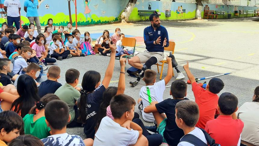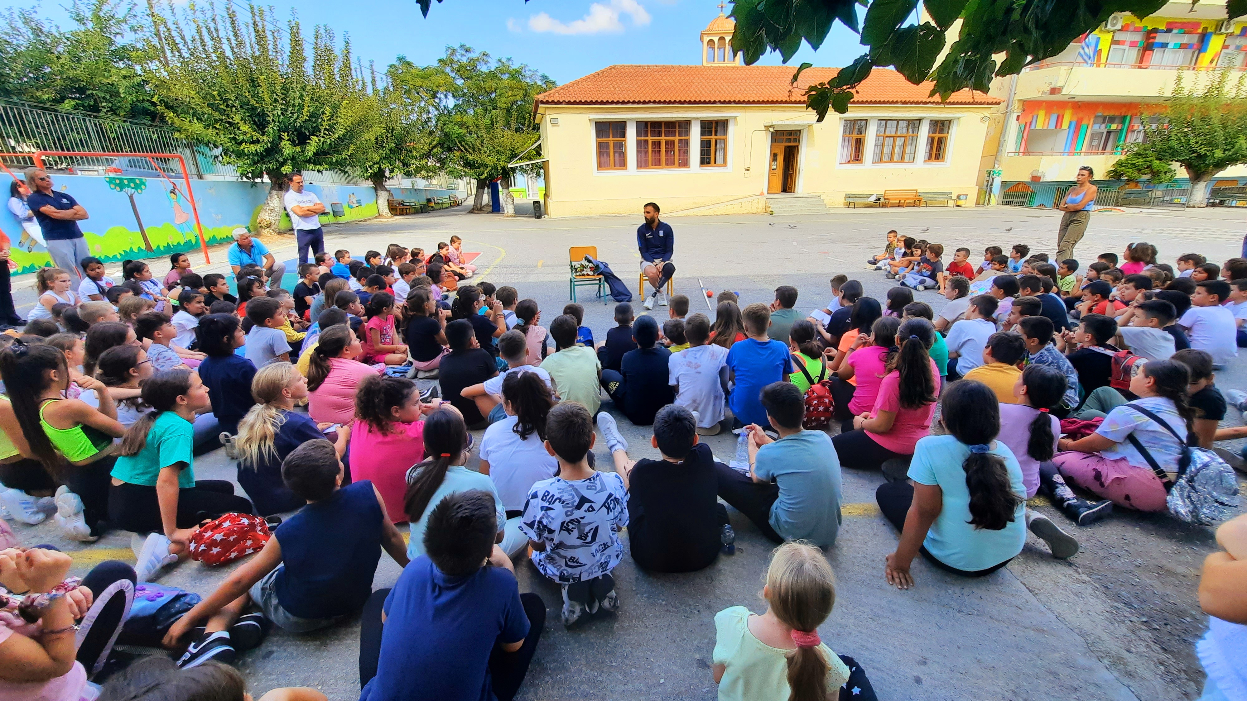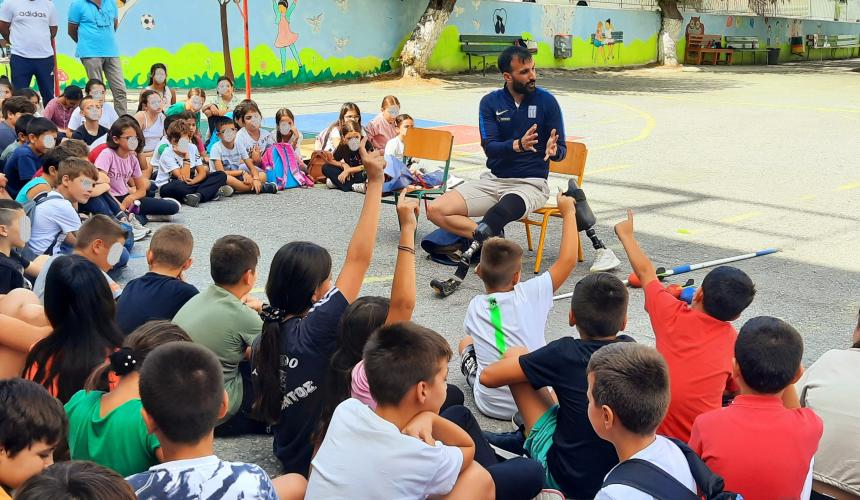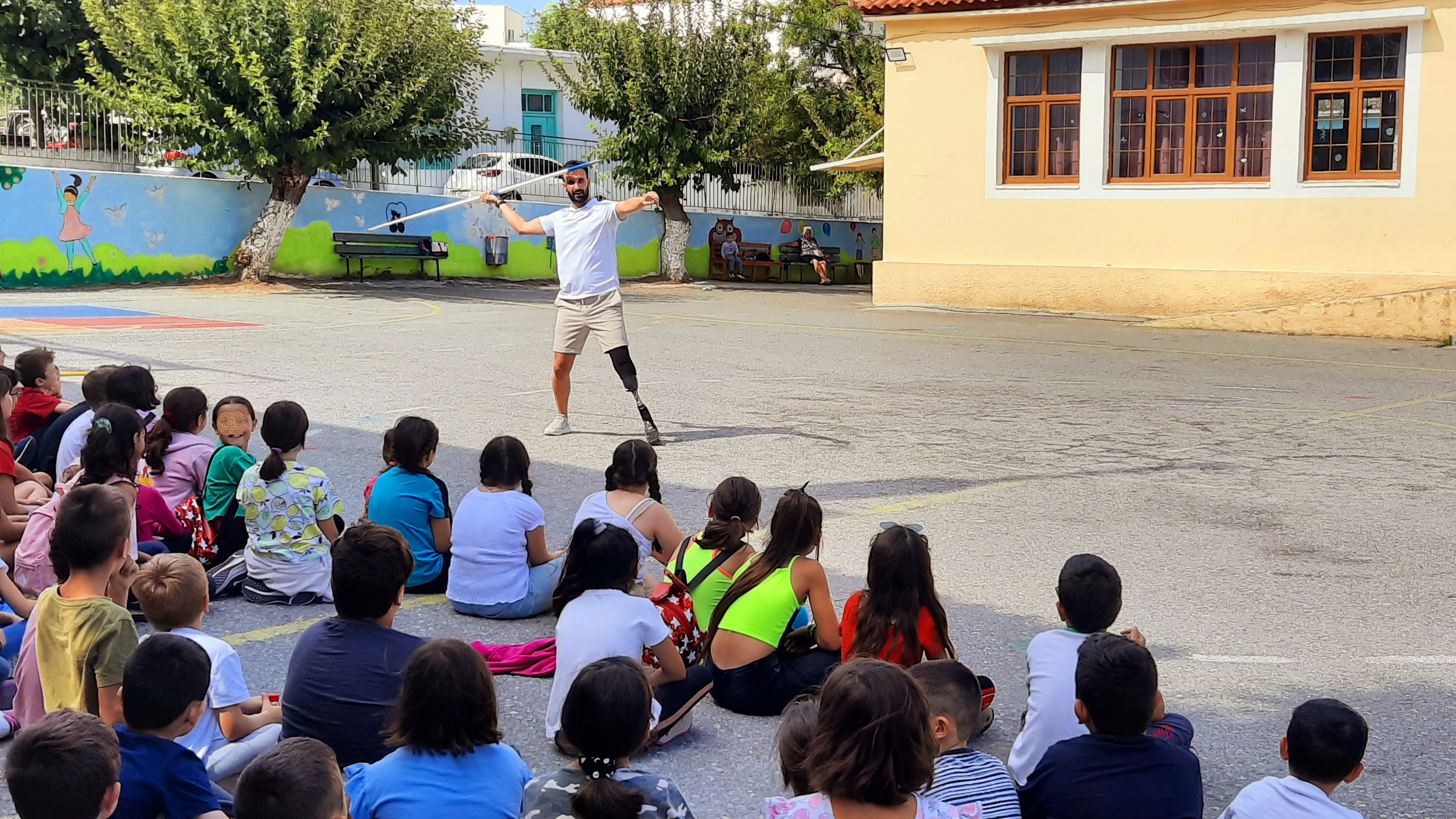 Επιπρόσθετα, στα πλαίσια της διοργάνωσης και της συμπεριληπτικής εκπαίδευσης, οι μαθητές είχαν την ευκαιρία να συνομιλήσουν με τον διακεκριμένο αθλητή ΑμεΑ κ Μανώλη Γιακουμάκη, μετά από πρόσκληση του συλλόγου διδασκόντων του σχολείου, τον οποίο υποδέχτηκαν με εγκάρδιο καλωσόρισμα. Ο χρυσός πρωταθλητής στο ακόντιο έγινε αποδέκτης πλήθους ερωτήσεων από τους μαθητές, τις οποίες απάντησε με μεγάλη προθυμία, μεταφέροντας στα παιδιά τις εμπειρίες από την πορεία του στον αθλητισμό και τη συμμετοχή του στο παραολυμπιακό κίνημα. Στην συνέχεια, στον αύλειο χώρο του σχολείου πραγματοποιήθηκε επίδειξη από τον κ Μανώλη Γιακουμάκη του αθλήματος του ακοντισμού καθώς επίσης και ένα εσωτερικό πρωτάθλημα ακοντισμού όπου ενθουσίασε τους μικρούς μαθητές του σχολείου.