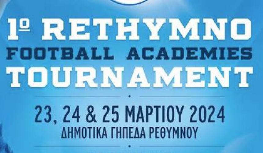 Με αμείωτους ρυθμούς συνεχίζονται οι εγγραφές για το «1ο RETHYMNO FOOTBALL ACADEMIES TOURNAMENT» το τριήμερο 23, 24 και 25 Μαρτίου 2024, που διοργανώνουν τα σωματεία ΡΕΘΥΜΝΙΑΚΟΣ ΑΟ και ΟΦ ΑΡΜΕΝΩΝ, με την συνδιοργάνωση της ΠΕΡΙΦΕΡΕΙΑΣ ΚΡΗΤΗΣ και την υποστήριξη του ΔΗΜΟΥ ΡΕΘΥΜΝΟΥ και της ΕΠΣ ΡΕΘΥΜΝΟΥ.