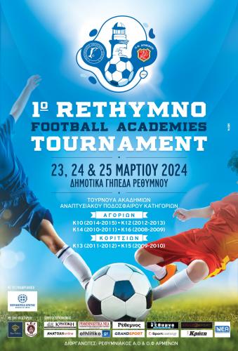 Το «1ο RETHYMNO FOOTBALL ACADEMIES TOURNAMENT» που θα διεξαχθεί το τριήμερο 23, 24 και 25 Μαρτίου 2024, διοργανώνουν τα σωματεία ΡΕΘΥΜΝΙΑΚΟΣ ΑΟ και ΟΦ ΑΡΜΕΝΩΝ, με την συνδιοργάνωση της ΠΕΡΙΦΕΡΕΙΑΣ ΚΡΗΤΗΣ και την υποστήριξη του ΔΗΜΟΥ ΡΕΘΥΜΝΟΥ και της ΕΠΣ ΡΕΘΥΜΝΟΥ.