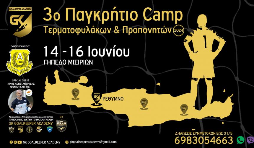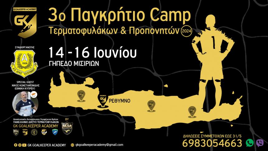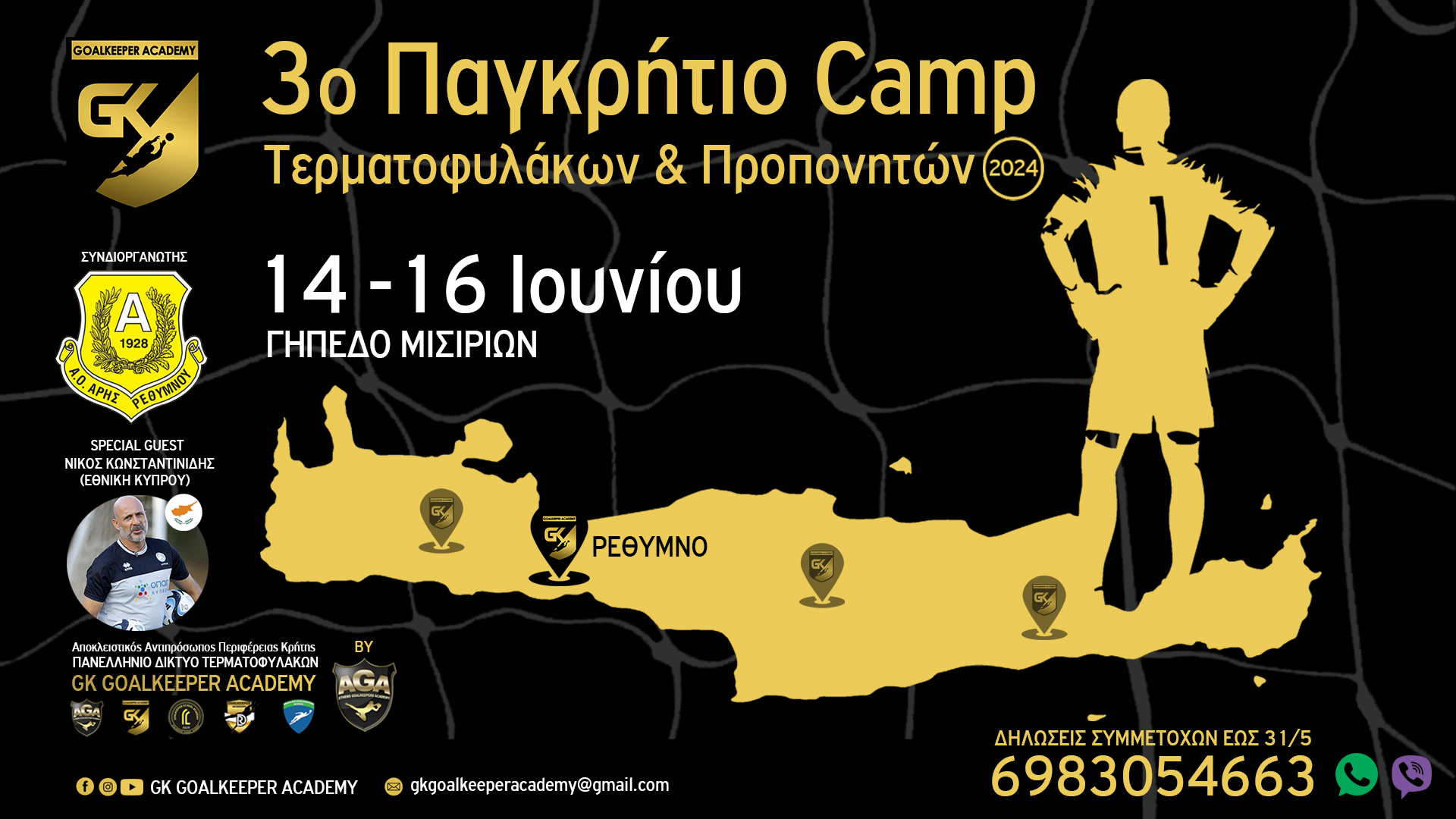 Οι ενδιαφερόμενοι παρακαλούνται να δηλώσουν άμεσα συμμετοχή στο ‘‘3ο Παγκρήτιο Camp Τερματοφυλάκων & Προπονητών’’, καθώς θα τηρηθεί σειρά προτεραιότητας. Οι εγγραφές για τον Νομό Ρεθύμνου θα γίνονται δεκτές μέχρι και την Παρασκευή 31 Μαΐου 2024.
